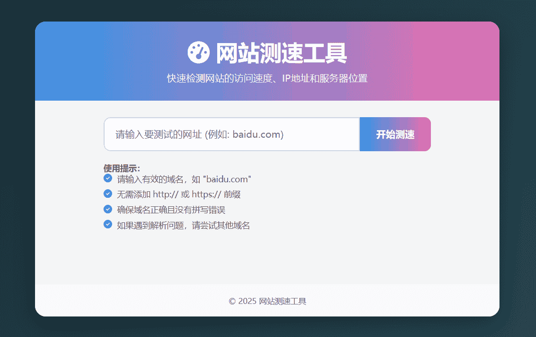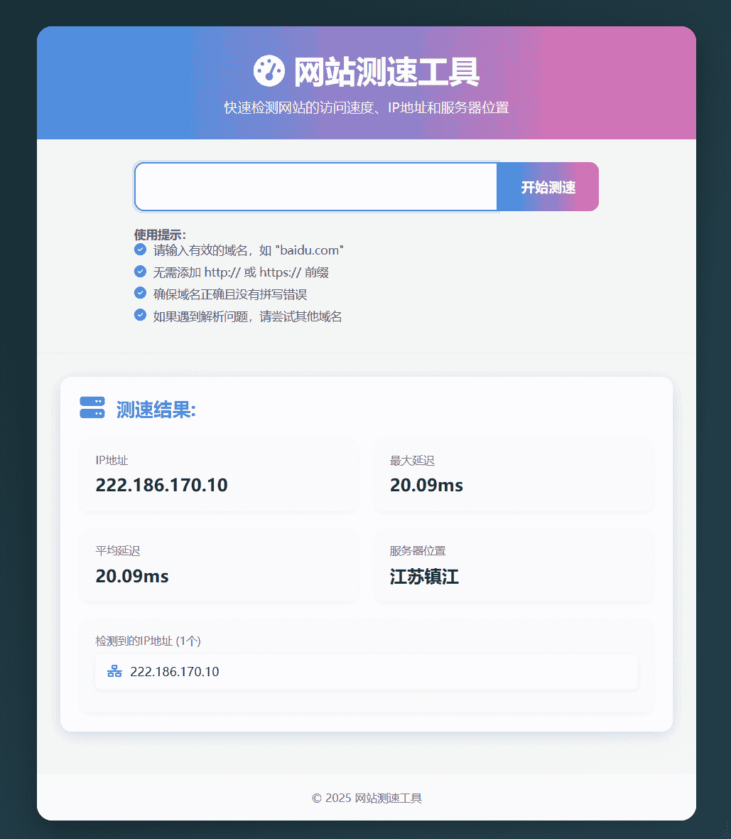网站测速工具提供专业级的网络性能检测服务,帮助用户精准测量网站延迟、识别服务器IP及物理位置,并支持全设备适配。其智能诊断功能可提供问题解决方案,适用于网站管理员、SEO优化师、企业IT部门及普通用户。主要使用场景包括网站性能基准测试、定期监控、主机性能比较及地区性访问问题诊断。