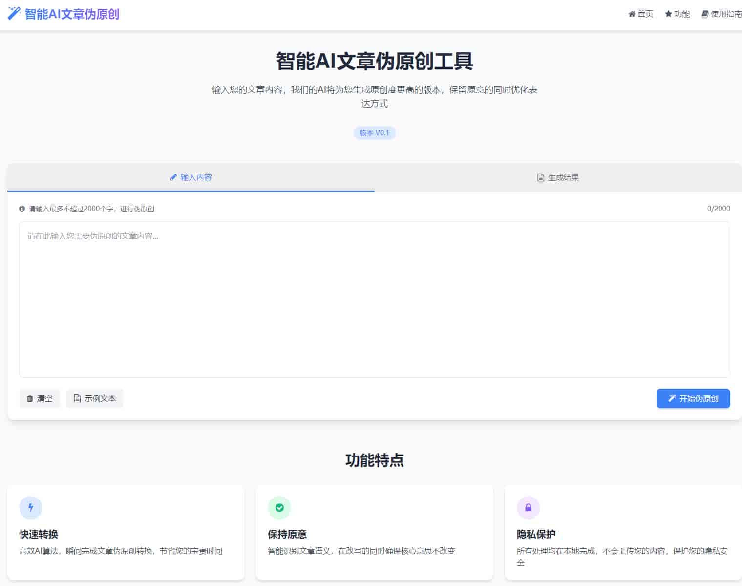 这个智能 AI 文章伪原创工具页面具有以下特点: