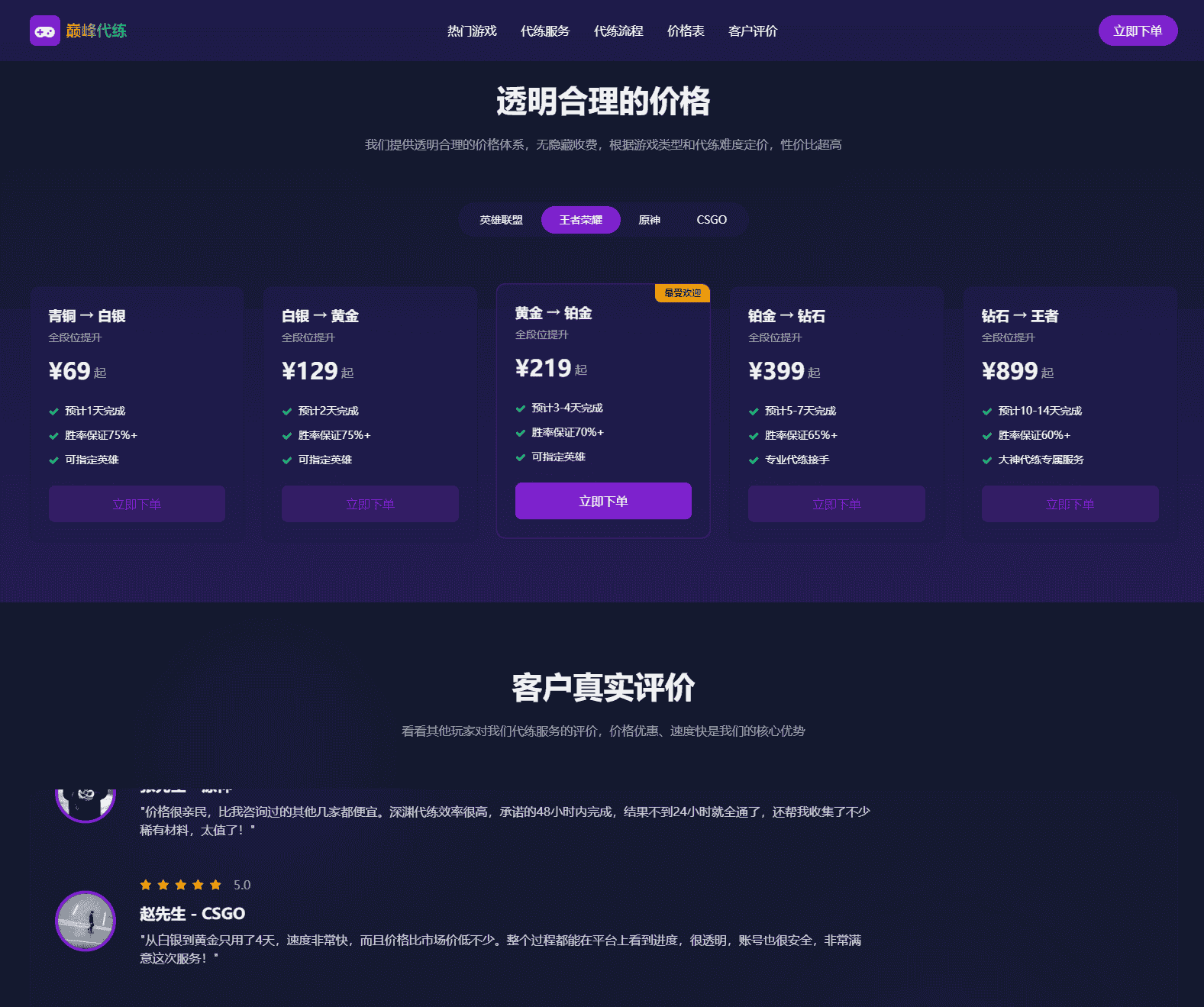 价格表切换:支持 4 大游戏价格一键切换,每个游戏包含 5 个主流段位 / 服务套餐,标注 “最受欢迎” 选项,降低用户决策成本