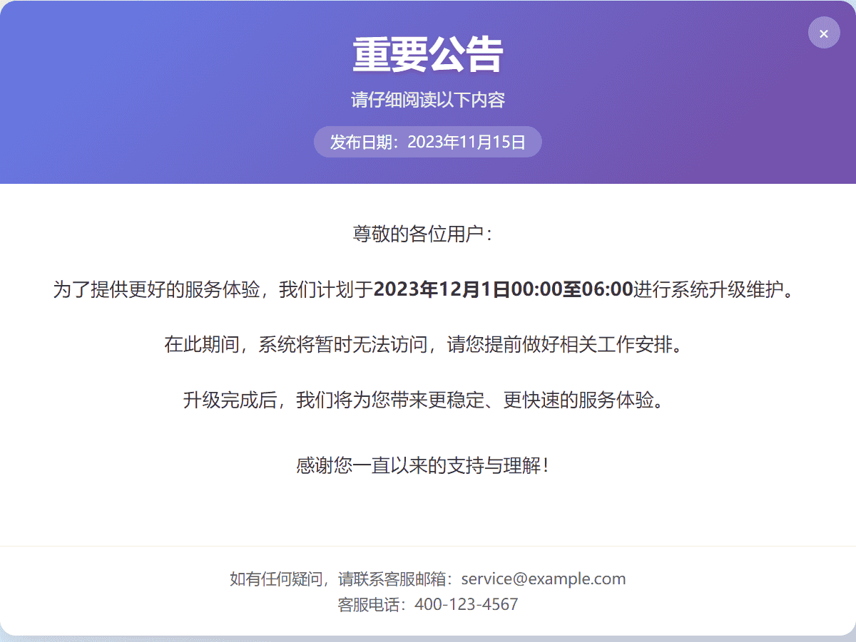 [免费源码] 单页HTML好看的弹窗公告代码 带关闭按钮