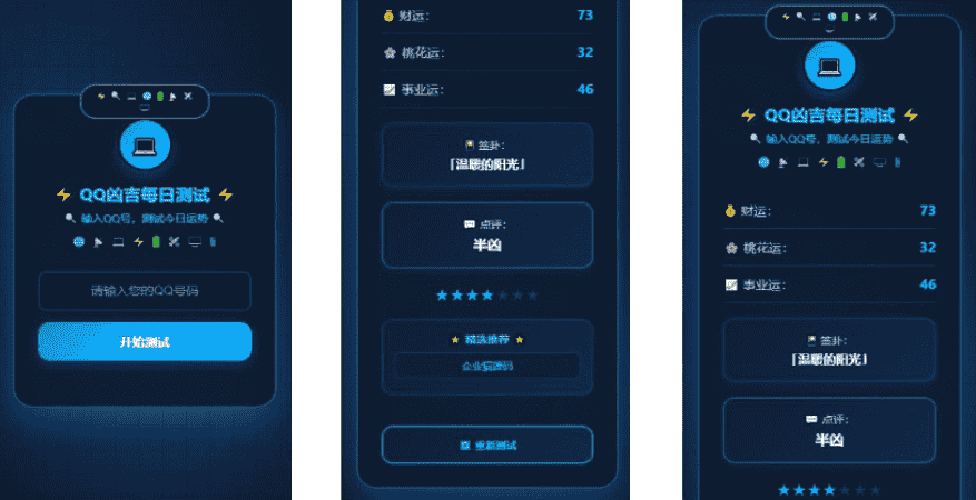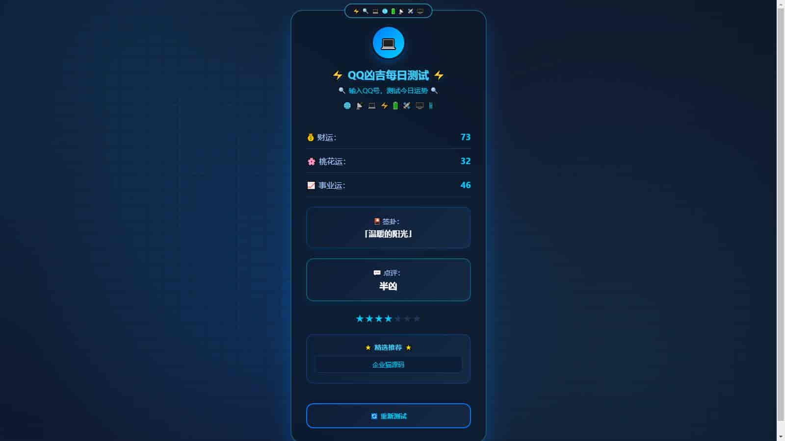 这是一个科技风格的QQ每日运势测试网页应用,采用科技风设计 科技风格的界面风格,输入QQ号即可测试今日运势!