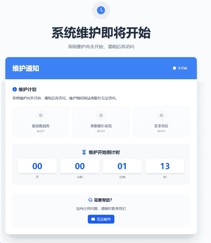 自动切换:倒计时结束后,页面自动切换到维护完成页面,无需手动刷新。