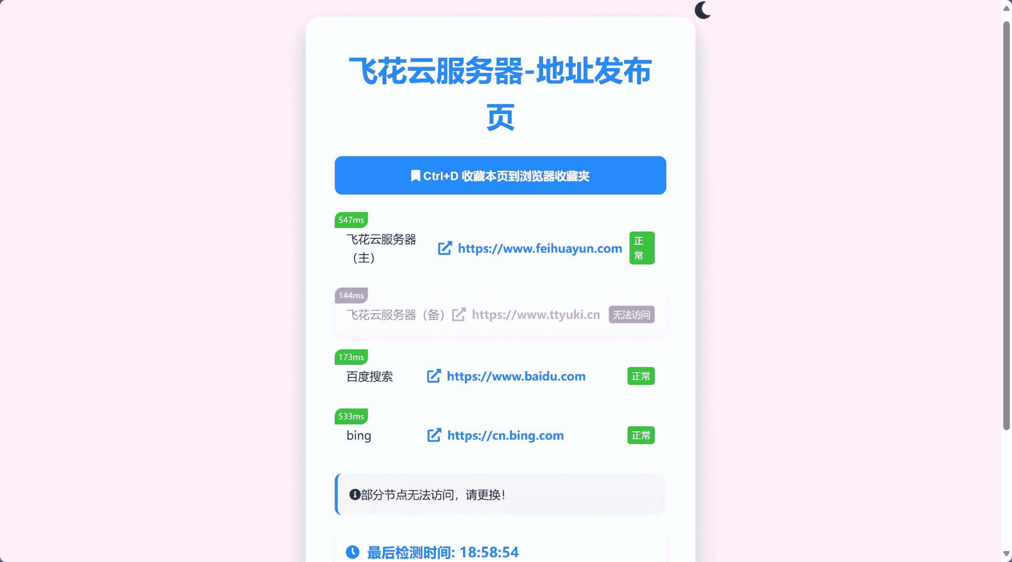 全新UI网址发布页源码_地址发布单页_带黑白模式自动检测是否能够正常访问,自动黑夜/白天模式,也可手动切换,主要是页面好看。
