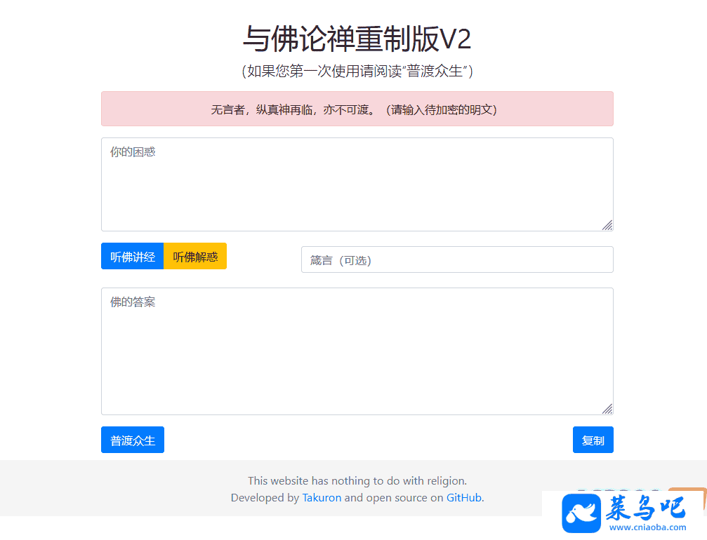 与佛论禅翻译系统 一个翻译佛论的娱乐系统,类似于核心价值观加密,github上找的,分享仅仅用于技术研究,此为升级版,每次加密得到的结果不一样,配合箴言功能,更加安全