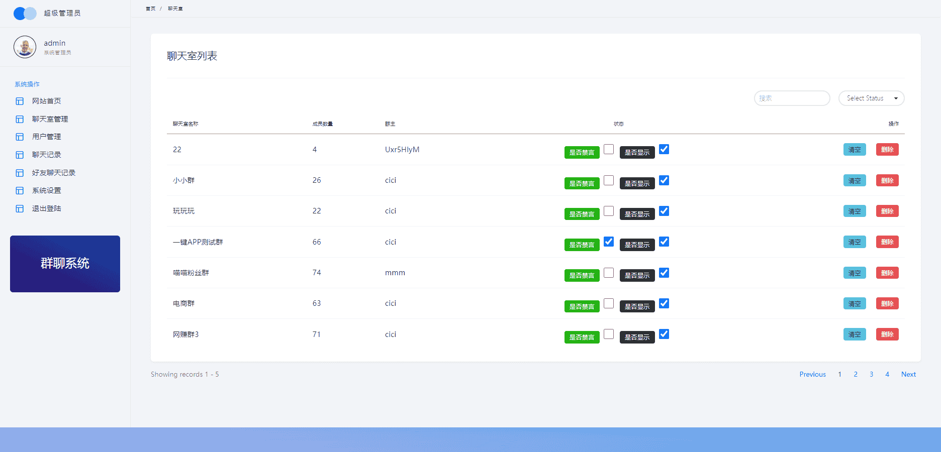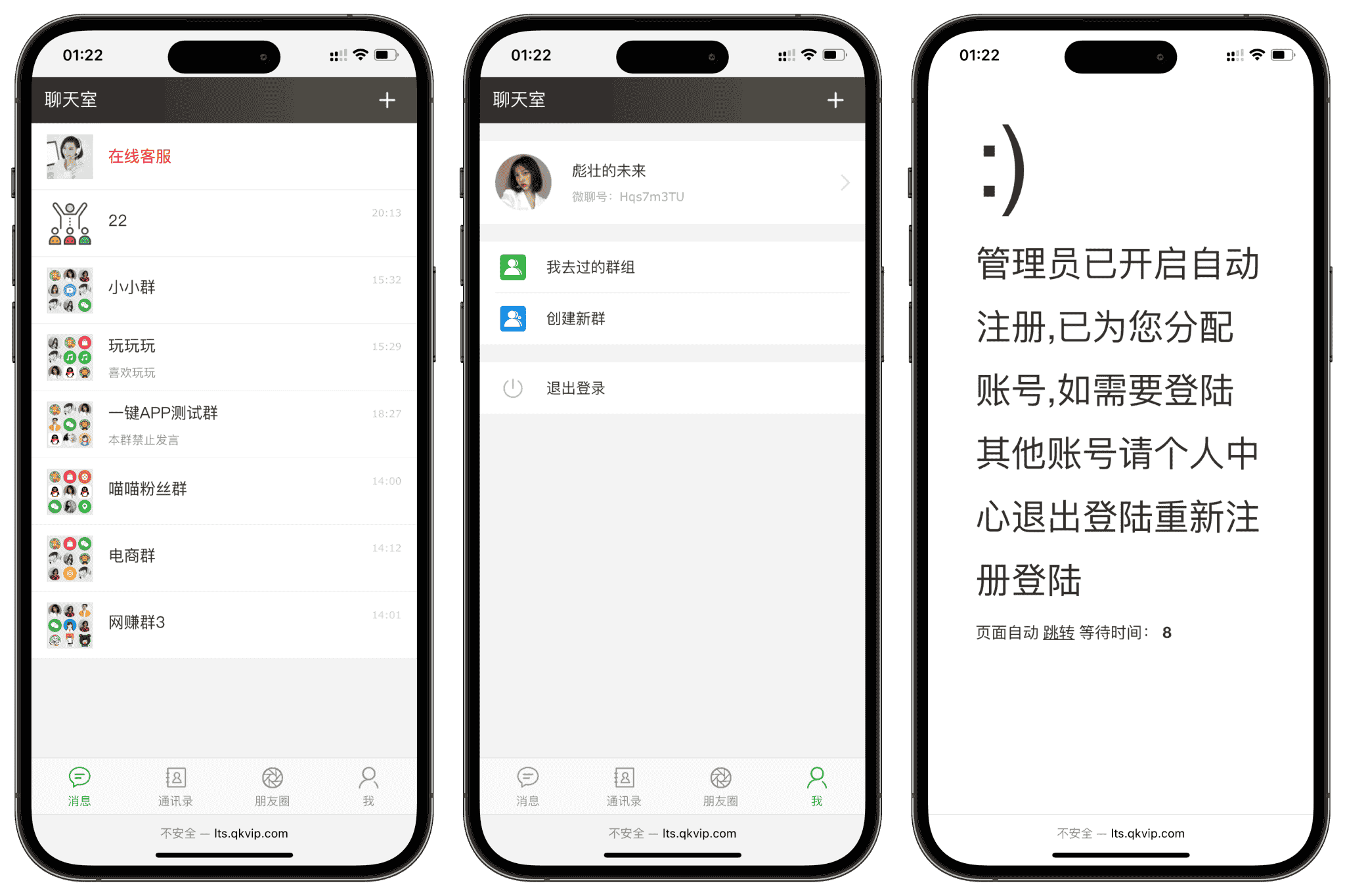 挺不错的一款在线实时群聊聊天室源码,访问首页带自动注册账号功能,支持用户创建群聊,设置群禁言