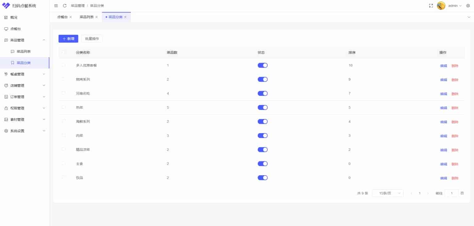 菜品分类管理:设置菜品包含的分类,商户点餐端可以根据分类快速查找商品,同时顾客点餐端也会根据菜品分类展示菜品。