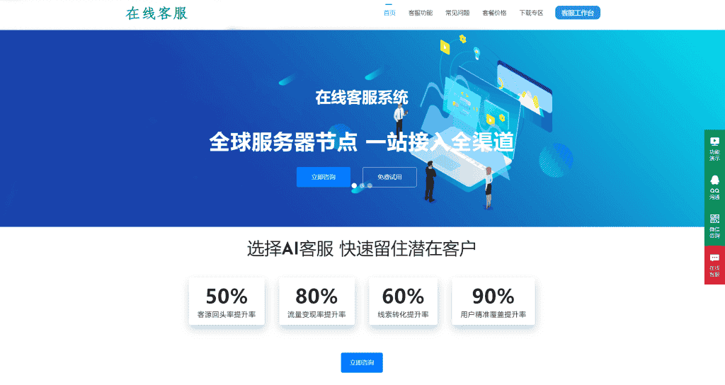 一行JS代码就可以快速接入(接入后右下角有客服图标显示),也可用按钮加对话链接,