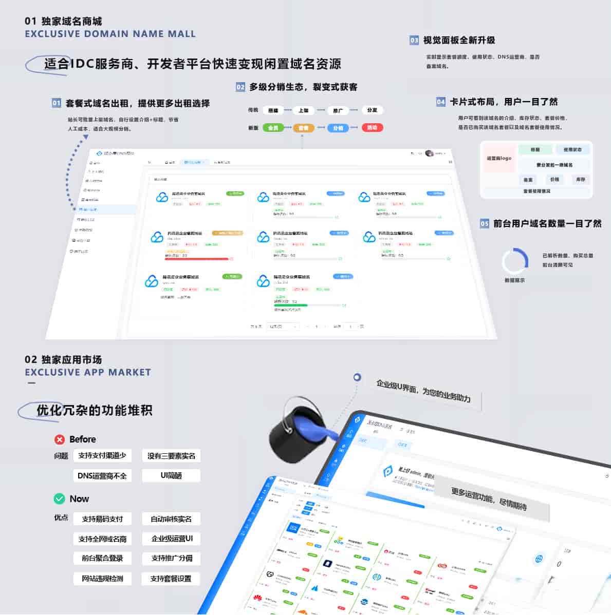支持多级套餐组合(如基础版/企业版/定制版),按需配置域名解析配额、功能权限与价格;