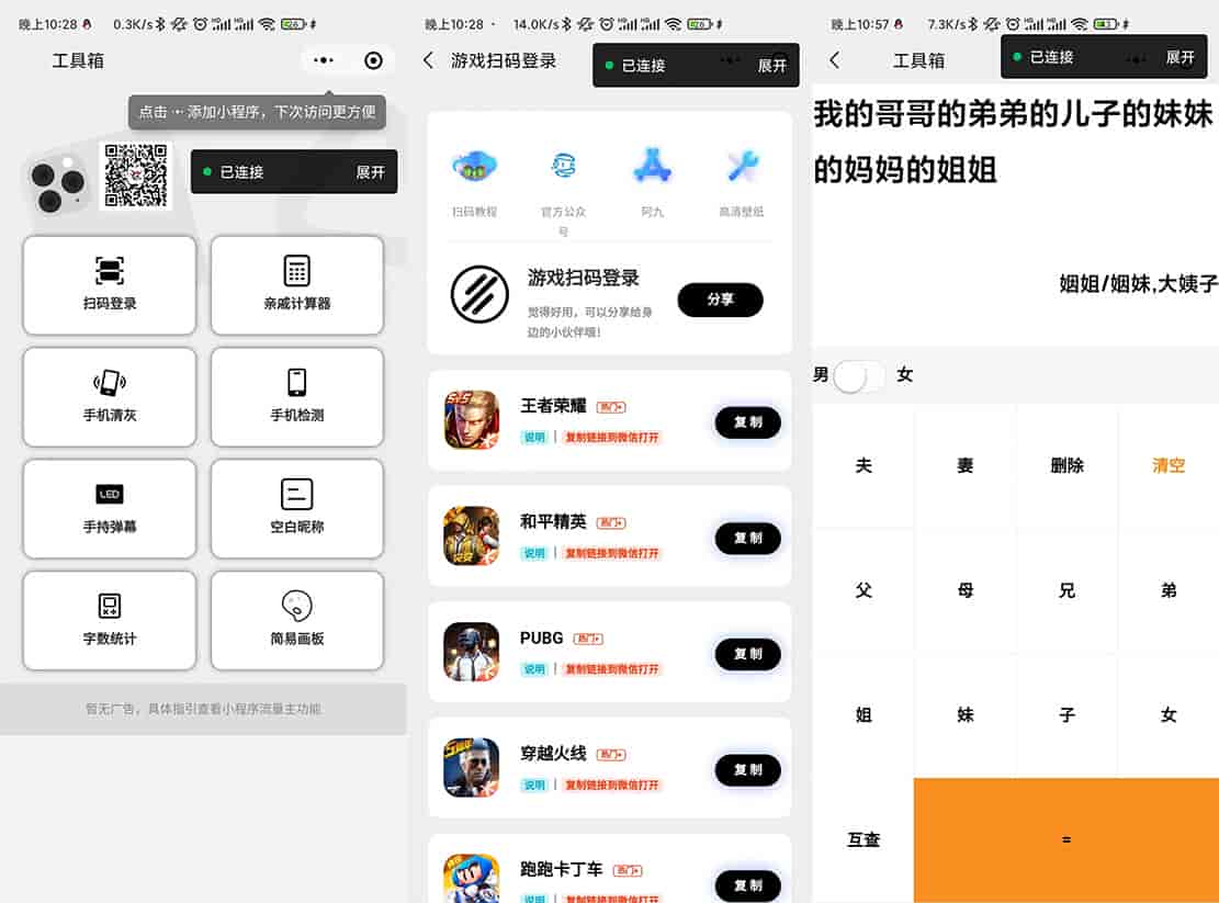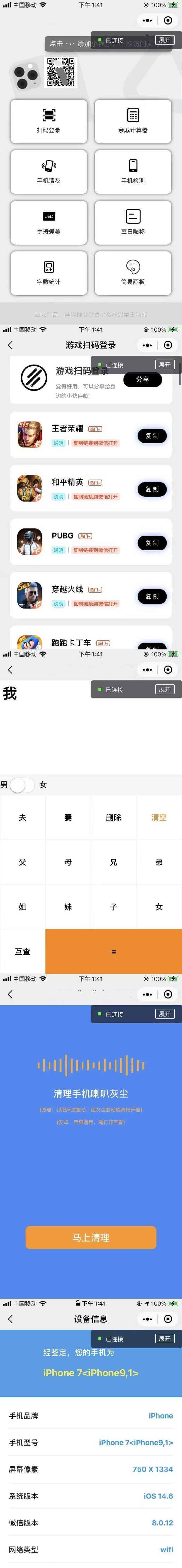 小程序主要功能有,1.游戏扫码登录:支持热门游戏,比如《王者荣耀》、《和平精英》等使用扫码登录功能。2.亲戚关系计算器:帮助你计算亲戚关系,比如你想知道妈妈的妈妈怎么称呼,这个计算器可以帮到你。3.手机清灰:通过高低压震动喇叭的效果,达到清理手机灰尘的效果。4.手机检测:可以检测你的手机是否为正品型号等信息。5.手持弹幕:输入你想要显示的文字,然后文字会以弹幕形式滚动显示。6.空白昵称:适用于游戏玩家们用来装逼的昵称设置。7.字数统计:如果你不知道一段文字有多少个字,只需复制进去,它会为你统计好字数。8.简易画板:提供一个画板,你可以在上面随心涂画。