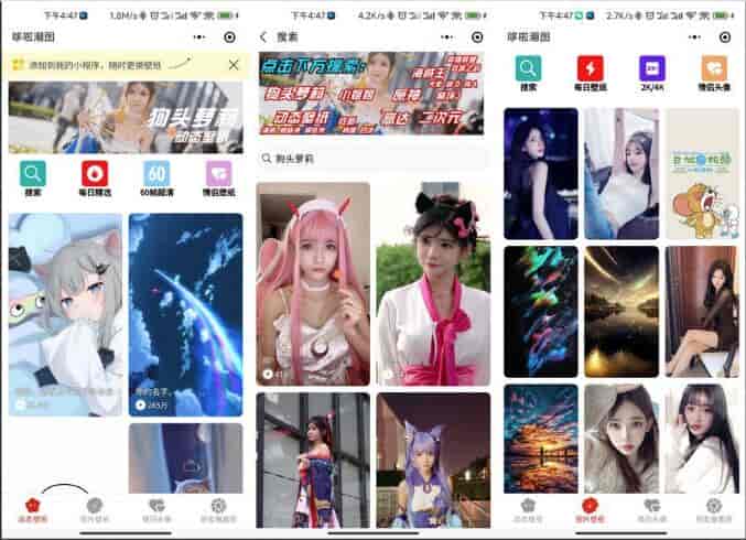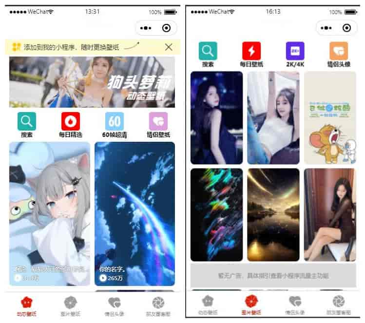 [微信源码] 动态壁纸小程序图片壁纸情侣头像朋友圈套图静态壁纸头像潮图资源超多自带流量主微信小程序