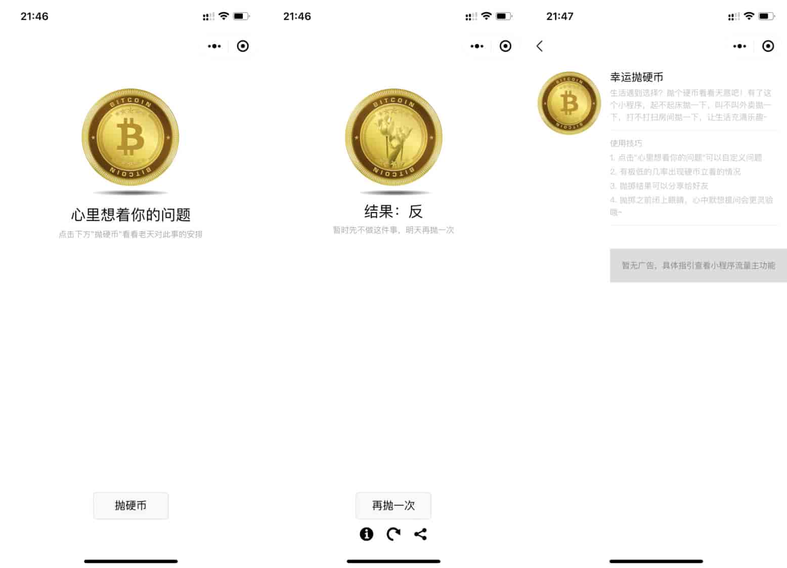 源码描述这个小程序也就是一个简单的抛硬币,没有什么其它额外的功能,人生决定不了的决定,就让上天来决定吧。日常生活中遇到选择?抛个硬币看看天意吧。有了这个小程序,起不起床拋一下,叫不叫外卖拋一下,打不打扫房间拋一下,让生活充满乐趣~。小程序安装挺简单的,一个微信开发者工具就可以了,也无需设置任何的合法域名。