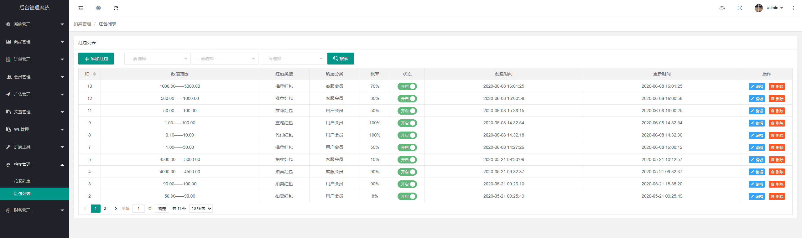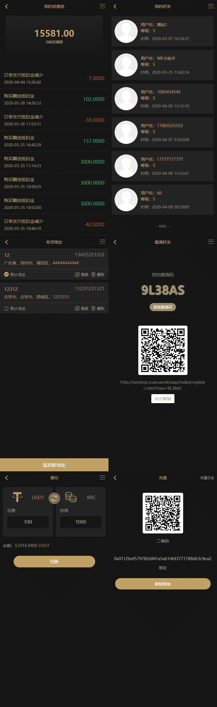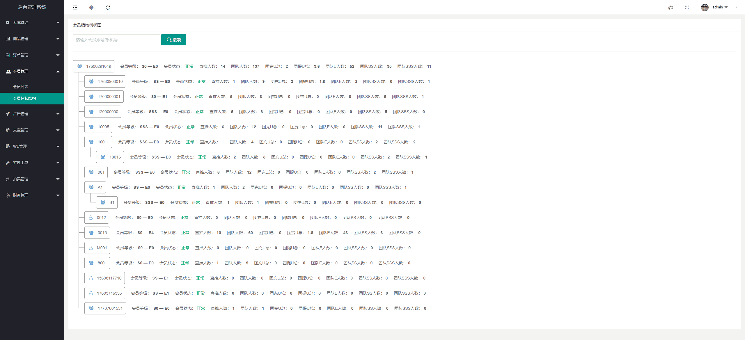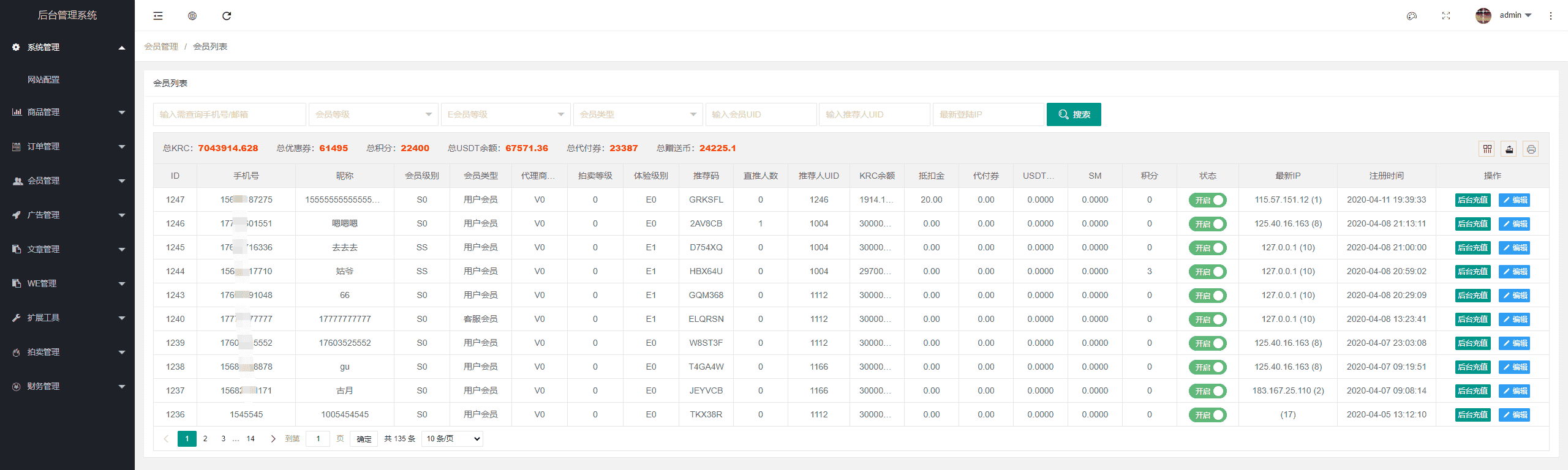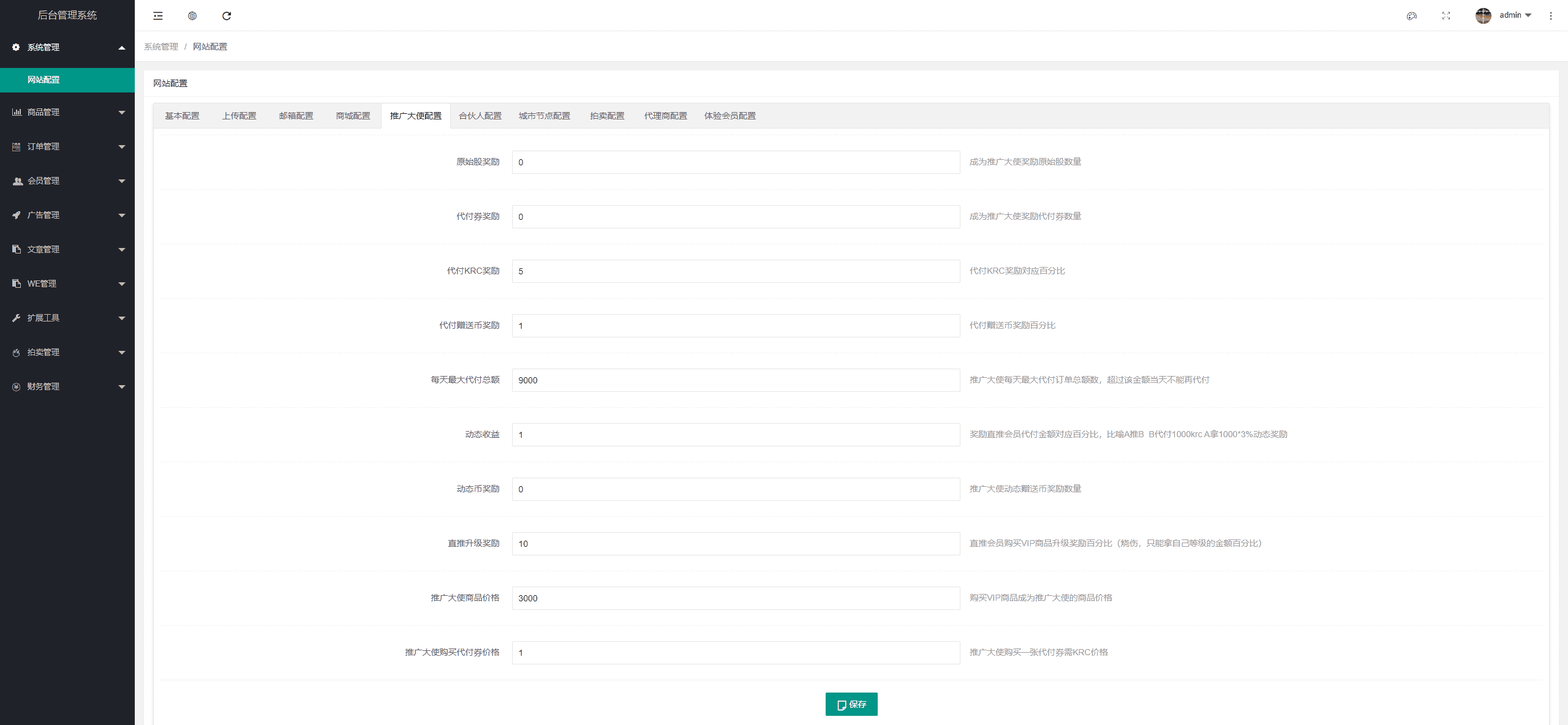 系统附带竞拍功能、推广功能、合伙人、虚拟币支付功能、原始股等功能,反正看着比较牛逼的东西