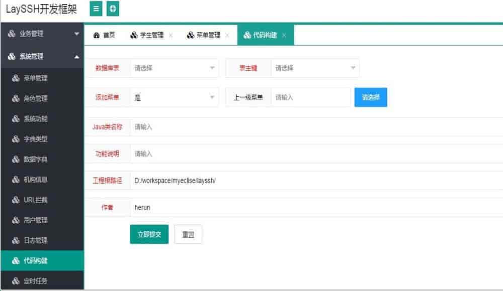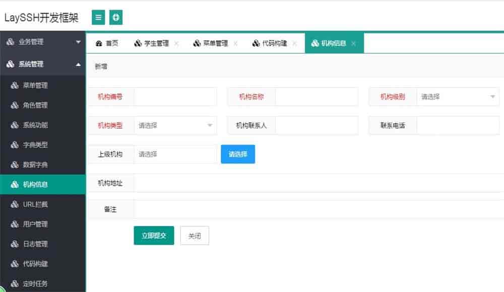 layui+java ssh快速开发框架系统源码基于LayUI+SpringMVC+Spring+Hibernate+Mysql搭建而成,内置代码生成器,能够快速生成增删改查代码,节省开发时间,快速构建企业级的web应用系统。 该框架具备一整套完整的权限管理系统,代码简洁,容易入门,适合开发者研究学习。