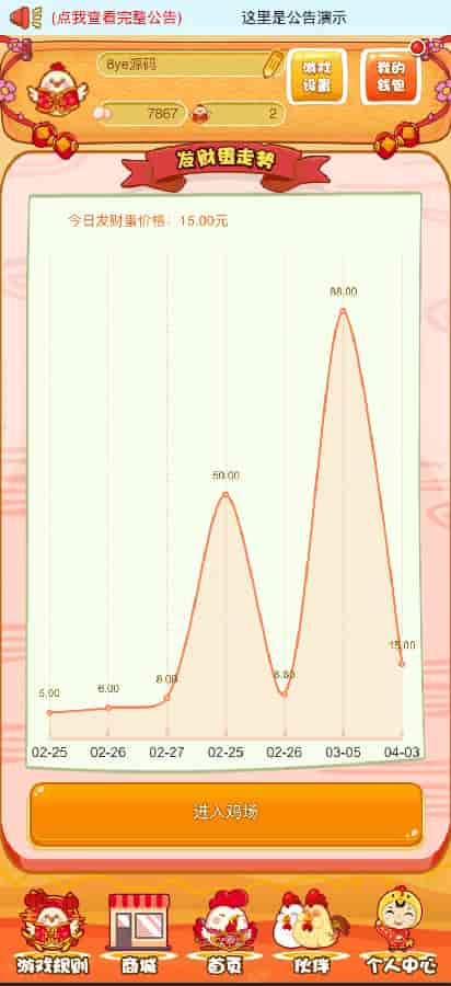 牧场养殖养鸡游戏,母鸡可以下蛋,鸡蛋可以买卖,游戏里自带交易商城,具体的玩法和规则游戏里面有介绍。和那些区块链的模式差不多,母鸡下蛋产生收益,喂养需要饲料,自带推广,短信接口现在自带的有,并且还可以用。有想换的话也可以自己换。