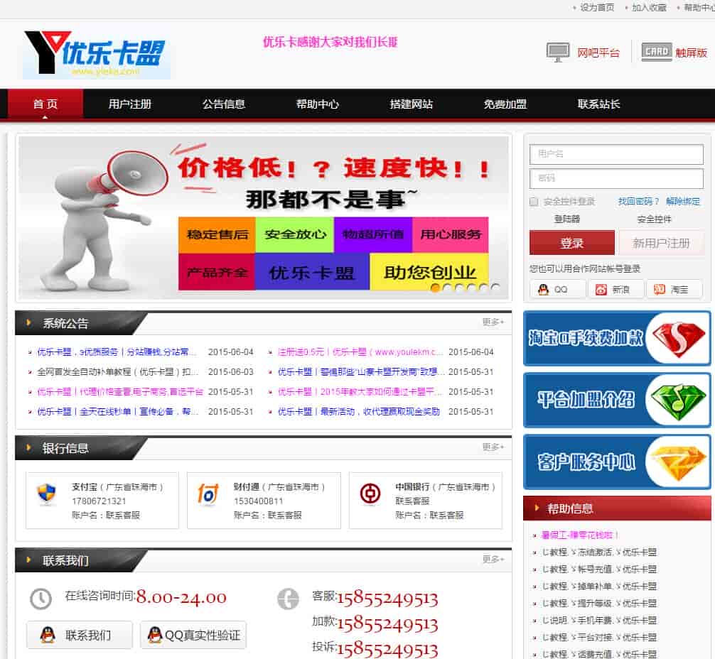 已经破解优乐卡盟,最新卡盟,源码,分站支持独立后台,10套风格,支付宝财付通都已经集成