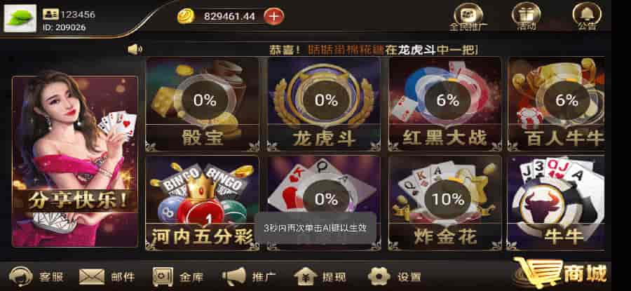 含十几款子游戏:印尼分分c、河内五分c、pc蛋蛋、幸运飞艇、骰宝、龙虎斗、百c乐、炸c花、黑红大战、百人牛牛、斗地主、牛牛、跑得快、红包、三公、百人推筒子、捕鱼。