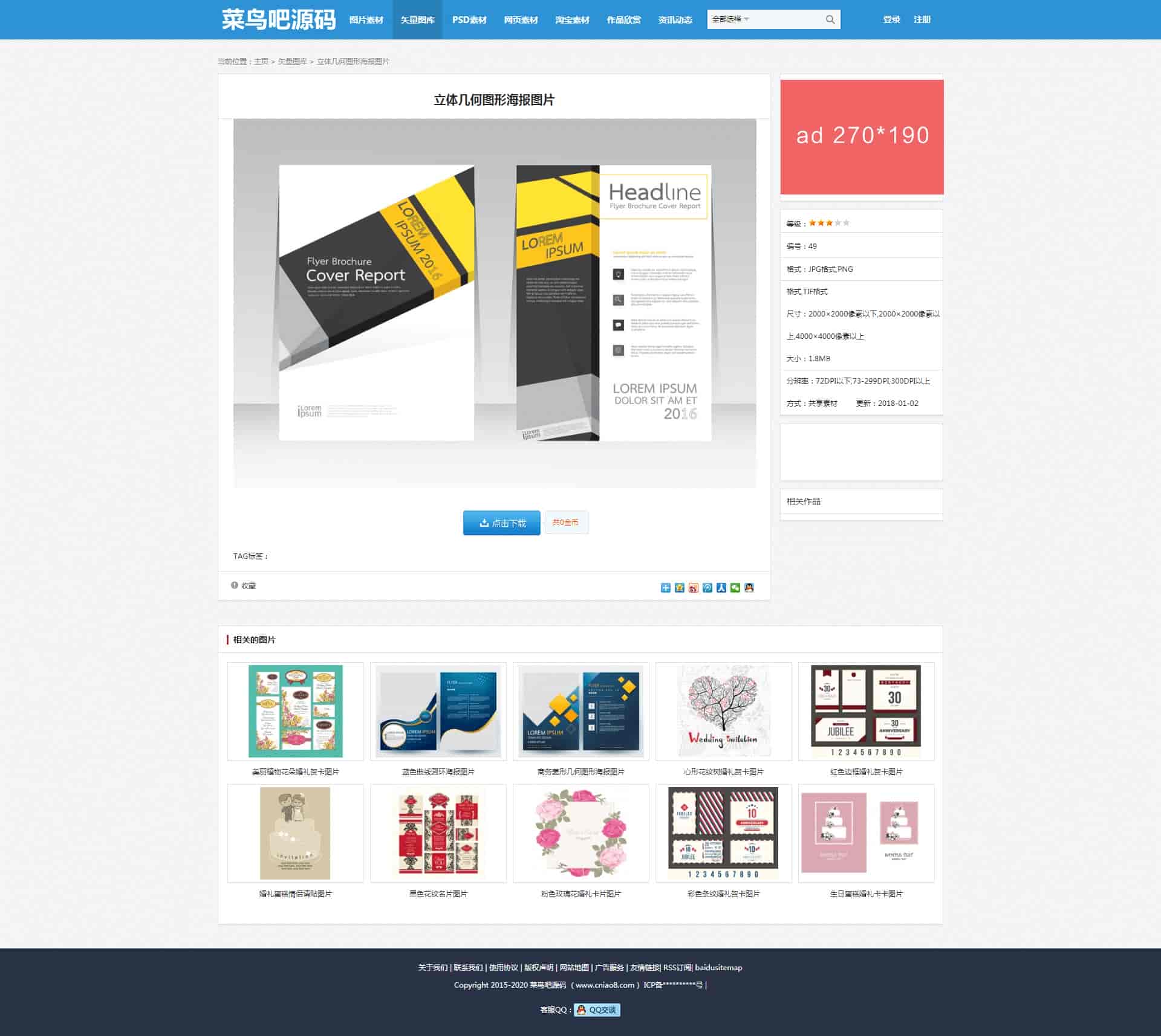 蓝色时尚素材分享类织梦网站模板,本套模板整站样式新颖大气时尚,展示内容丰富,后台管理方便,栏目设计丰富,设计独立模型,修改代码还可以实现在线购买的功能,本套模板比较适合素材分享类各种素材的网站使用,可以下载;本模板做了精简和简化,修改了数据库多余的表,修改了模板和样式文件,删除多余的无用链接和图片,本模板基于DEDECms 5.7 UTF-8设计,需要GBK版本的请自己转换。