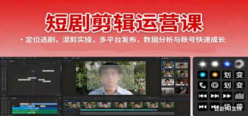 这是一门专为零基础学员设计的短剧剪辑运营全流程课程,从行业认知、账号定位选剧、混剪实操,到多平台分发、数据分析和团队协作,系统讲解短剧从0到1的完整变现路径,帮助新手快速入门并掌握短剧行业的全套运营方法。
