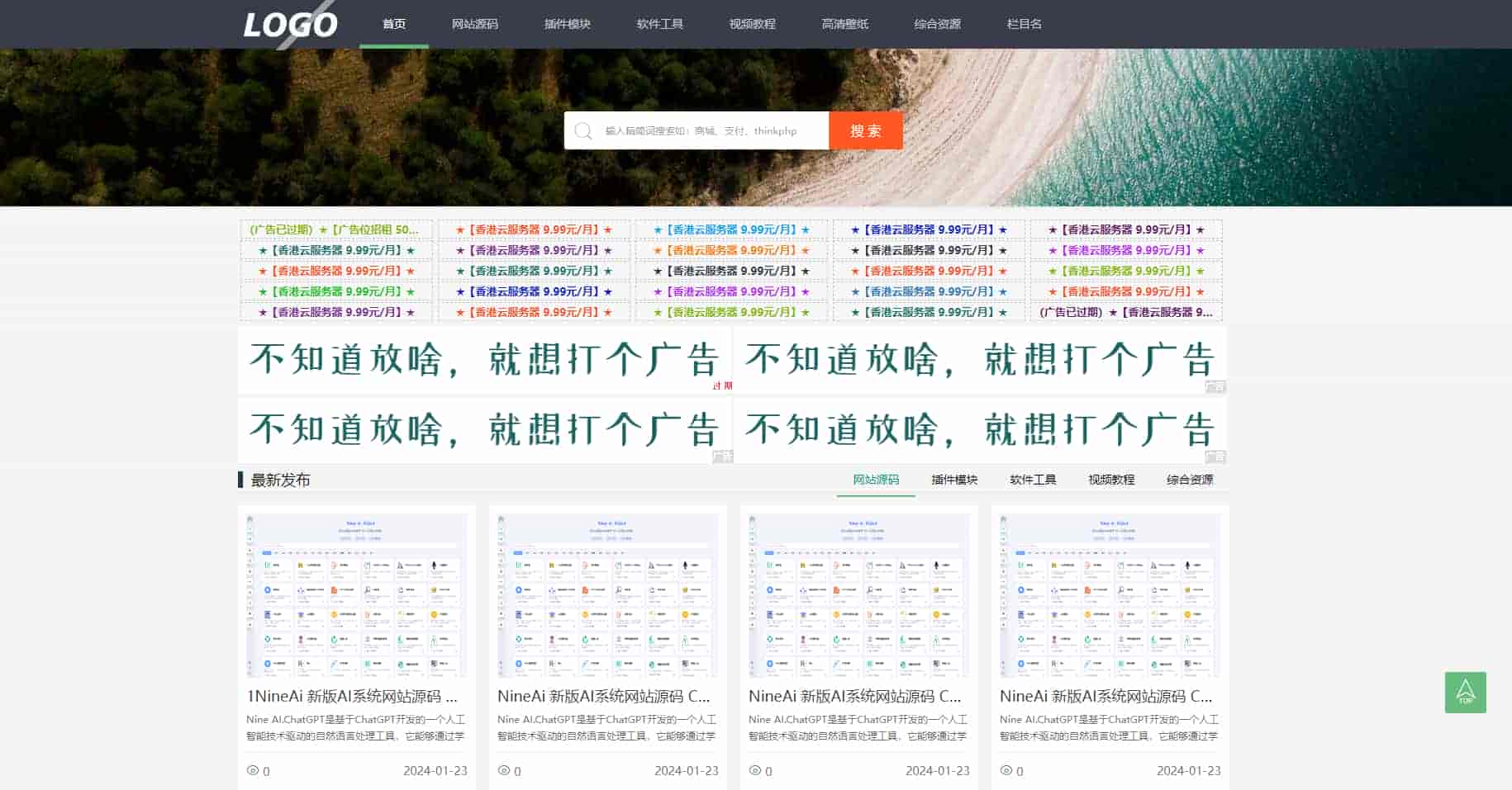 该网站模板采用自适应设计,每个栏目(模块)的筛选都不一样,可在后台模块里自由增加和删减。广告模块配置广告到期时间,到期后无链接且显示“到期”。适合源码类、资源分享类、图片类和线报类网站模板。