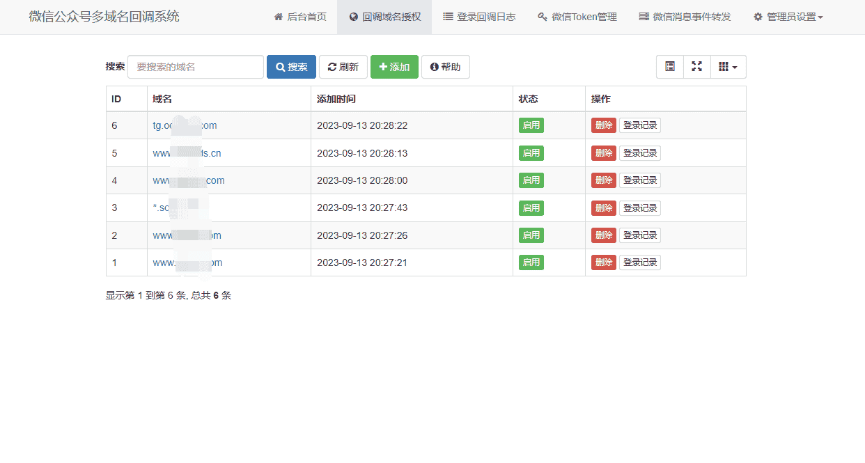 微信公众号多域名回调功能:微信公众号后台默认只能授权2个网页域名,用本系统突破这个限制,用同一个公众号对接无限多个网站。网站后台支持回调域名白名单的管理,以及登录记录的查看。