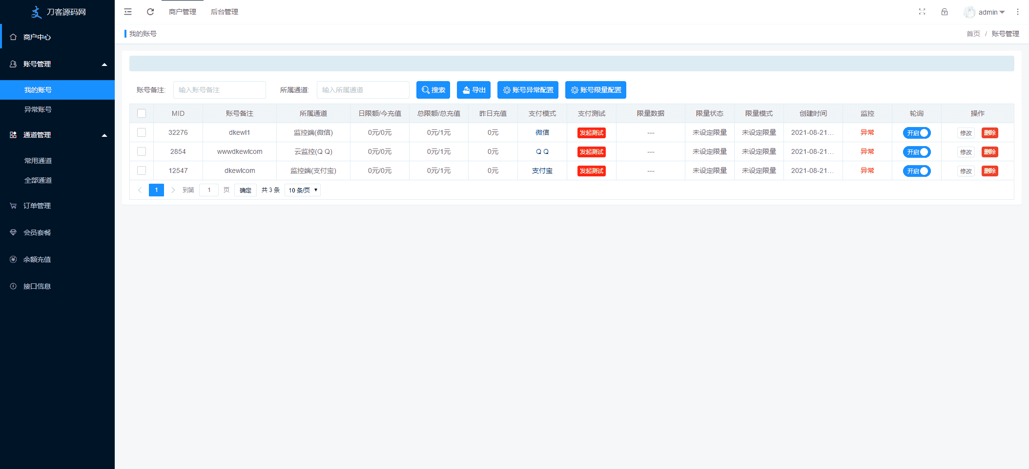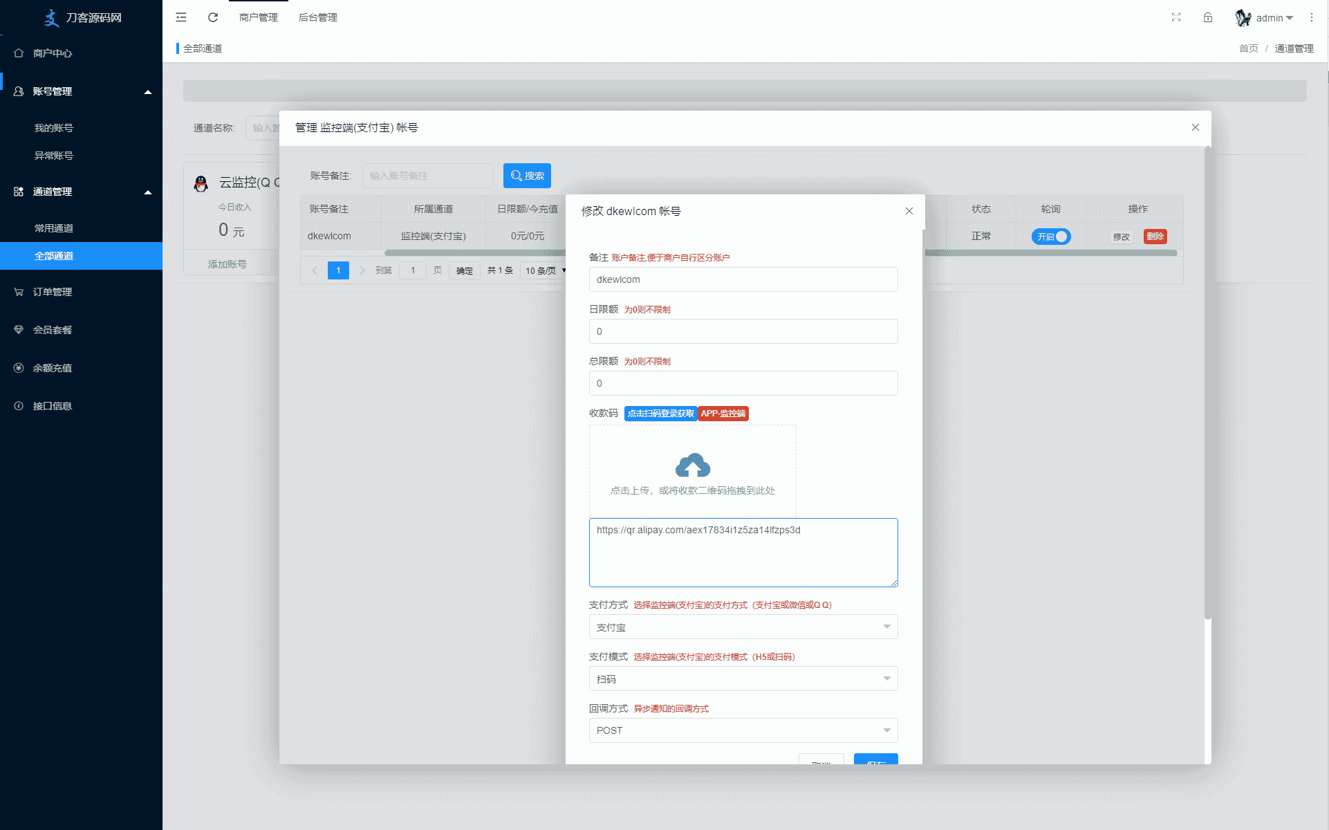 此免签码支付系统,兼容易支付接口,系统为多商户管理,商户额度控制 充值额度设置 订单时间设置 商户购买套餐设置 注册设置 域名设置(单独通道域名) 公告设置 商户通道管理等