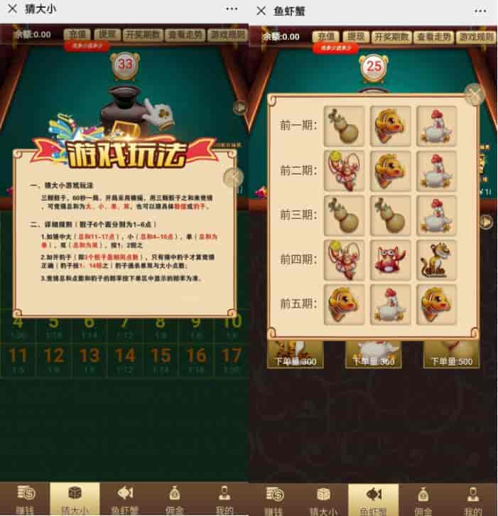 前台合并了筛子游戏和鱼虾蟹俩款游戏,玩家中奖信息实时列表滚动,首页游戏规则介绍,助力快速上手;