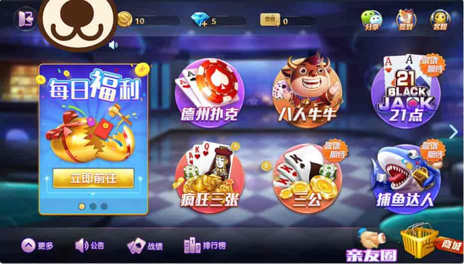 德友会是网狐旗舰版二次开发,属于金币和房卡双模式集合版本,这个游戏平台支持多种玩法,分别为金币场、积分、金币约战等,每个游戏都有初中高特四种类型房间,另外只有代理才可开启朋友圈,