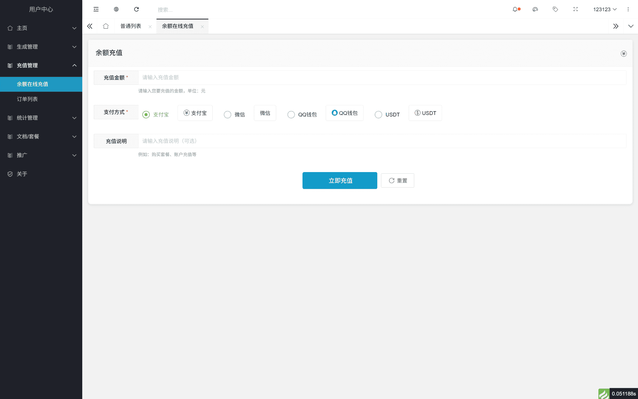 支付充值:余额在线充值制[支付宝,微信,QQ,USDT等多种支付方式]