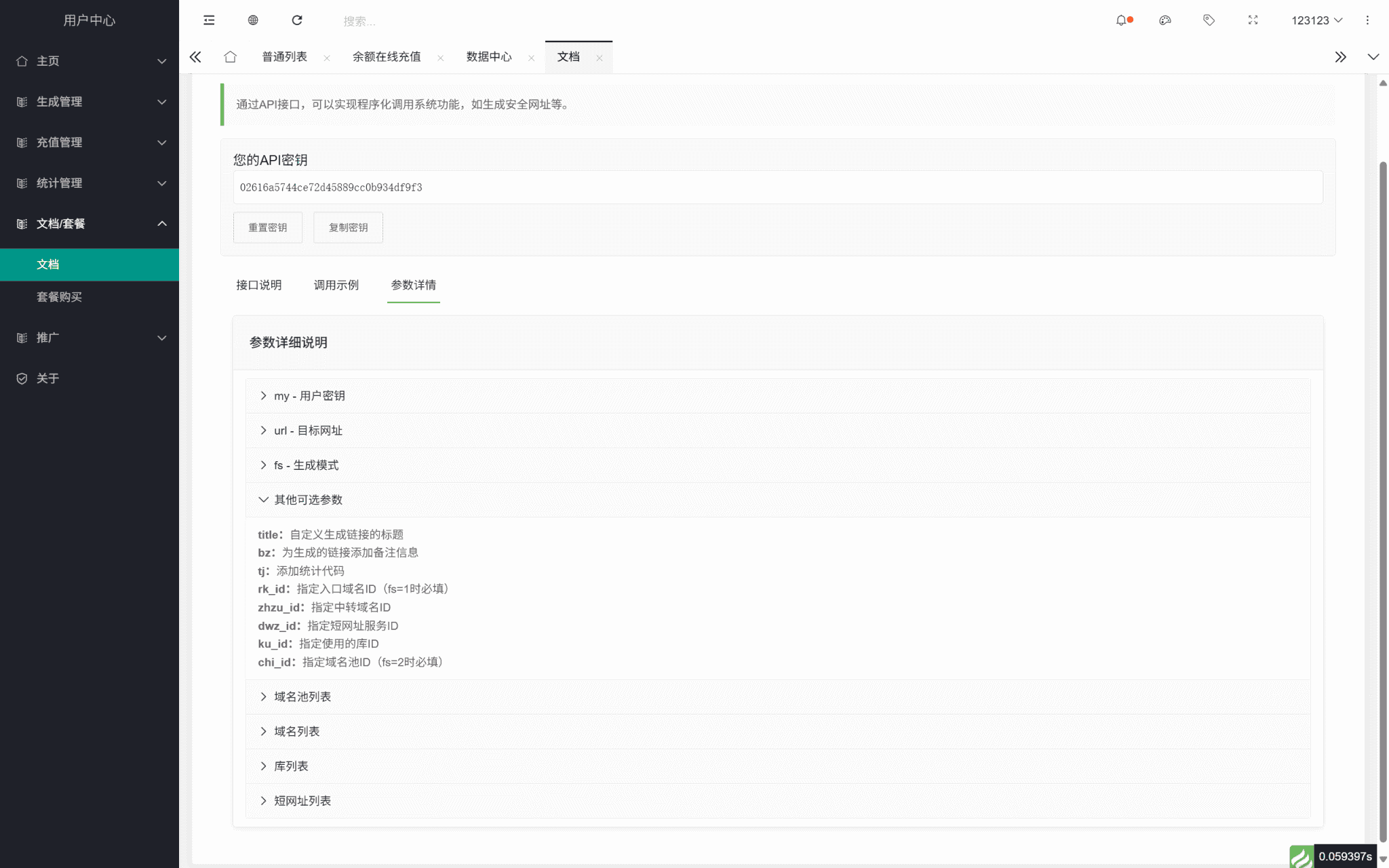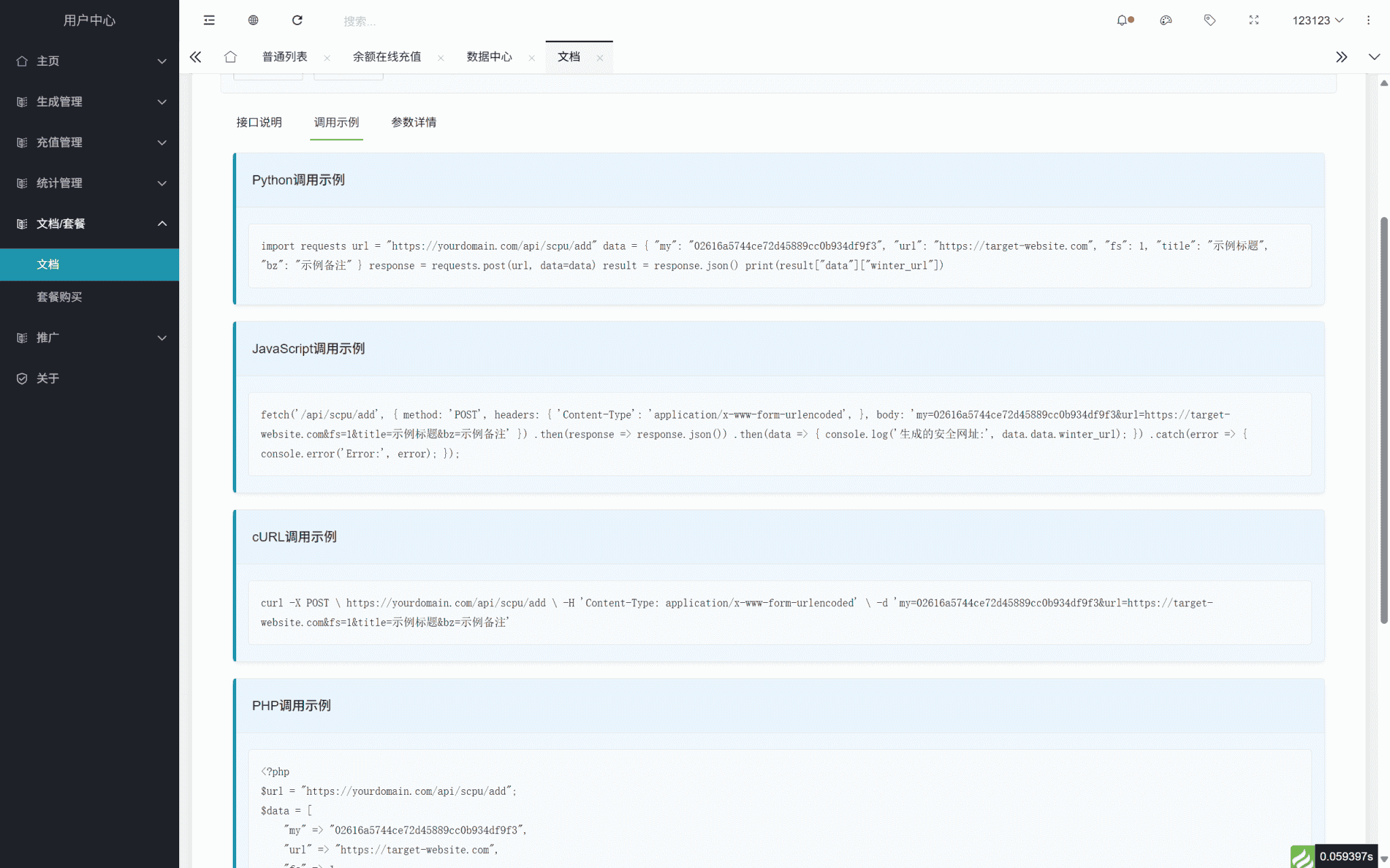 文档详情:提供详情参数,请求地址,可POST/GET请求数据,返回数据等,以及具体参数内容讲解与示范,Java/Python/Php/Curl等参考示例代码