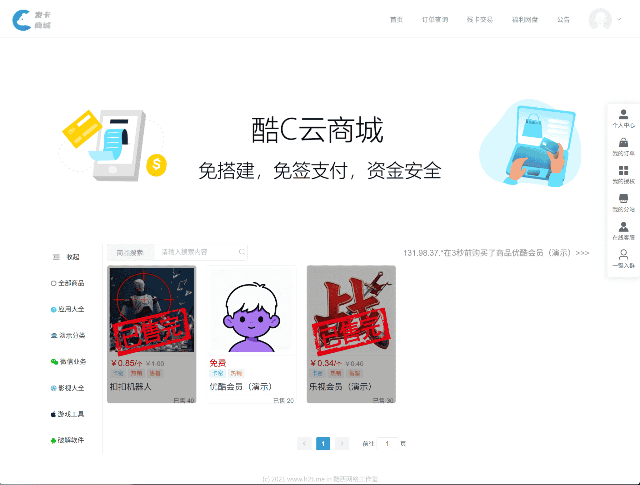 Cool-C 是一个功能完善的电商系统前端项目,采用 Vue.js + Element UI 构建,支持商品展示、在线购买、用户管理、残卡交易、网盘服务等多种功能。