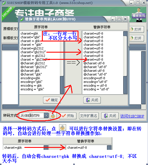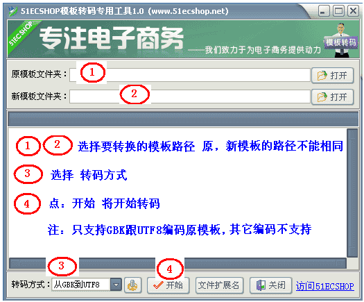 51EC模板转码专用工具是GKB和utf8模板编码转换器,只能用于GKB和utf8之间的相互转换,当下很多网站流行使用utf8编码,前期网站模板是gbk模板的朋友可以使用这个工具进行转换就可,需要注意的是后台程序必须支持utf8编码的,这个只是模板转换。