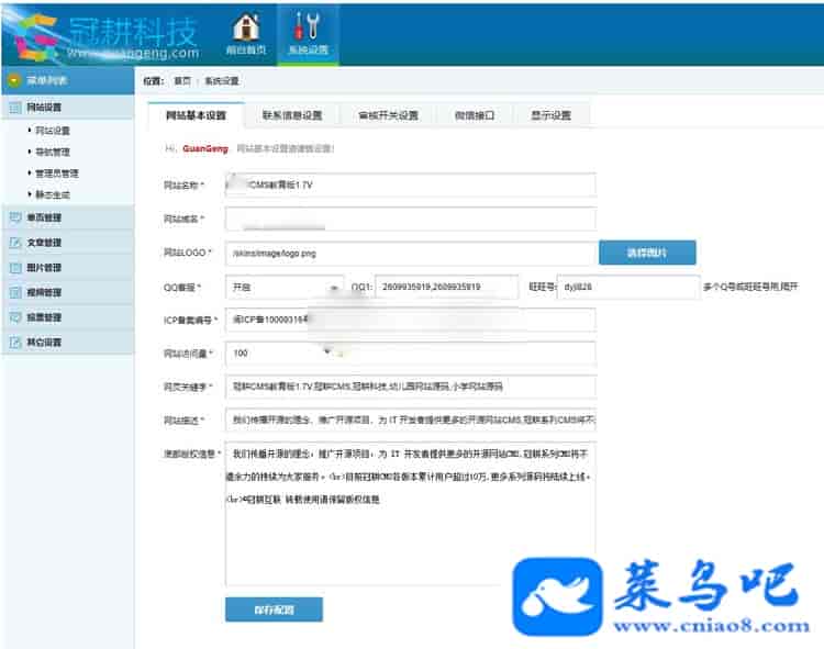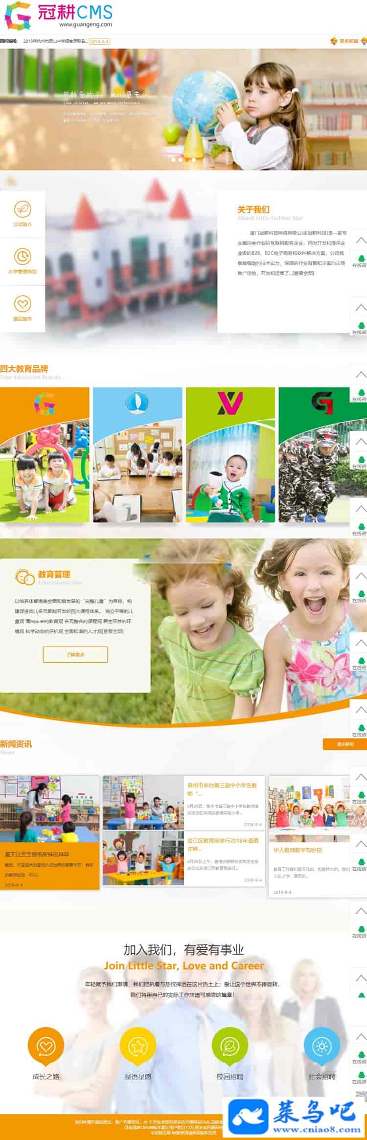 冠耕科技教育版 CMS,更加简约方便的后台管理设计,全自动伪静态。简约代码,让你的网站轻快流畅。全站 DIV+CSS 自动伪静态.html 结尾 关键词自动匹配设置 全面针对搜索引擎优化。图片批量上传,省去一张张上传的烦恼。文章,图集,视频 一应俱全!扩展修改性极强!