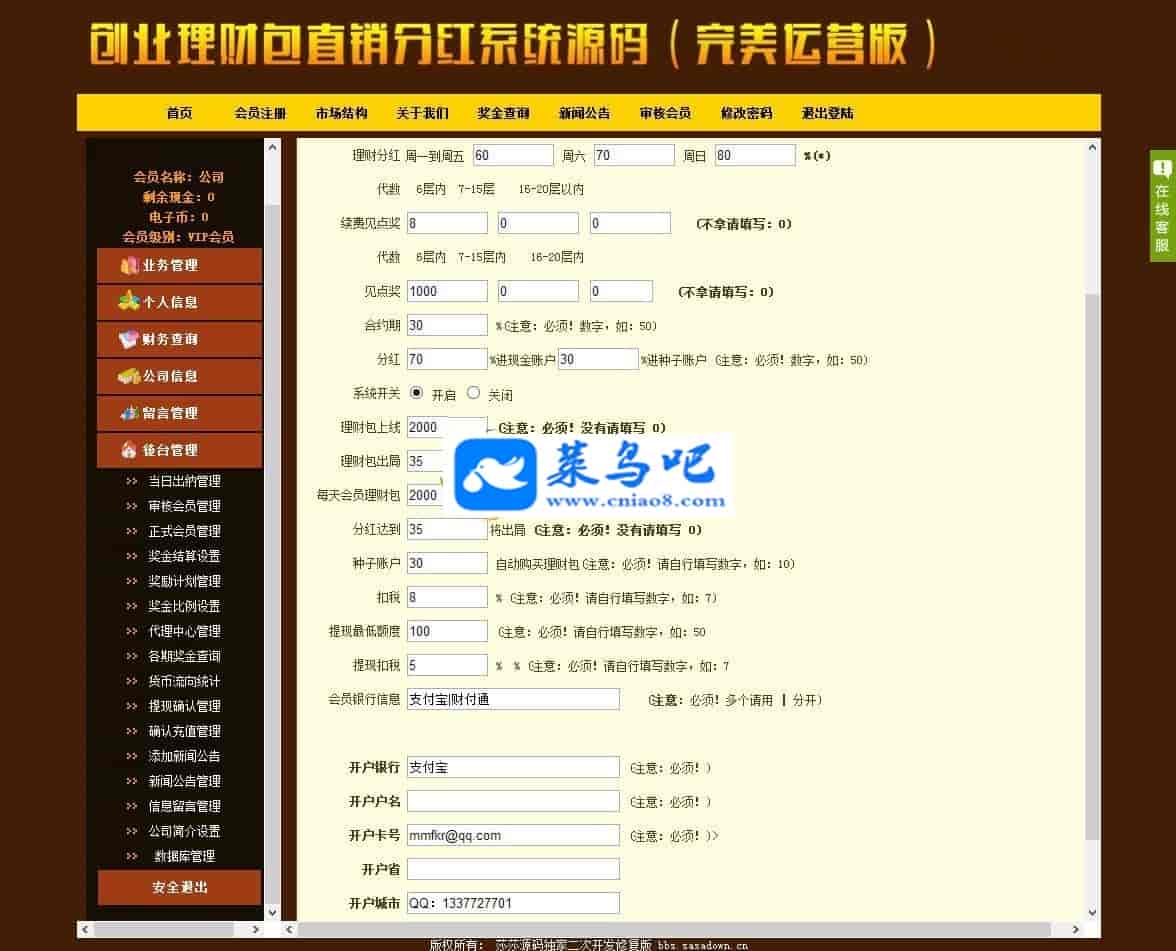 [ASP源码] 最火的创业Licai系统源码(菜鸟吧源码独家修复版)创业理财包直销分红系统源码 独家去除3个后门可完美运营