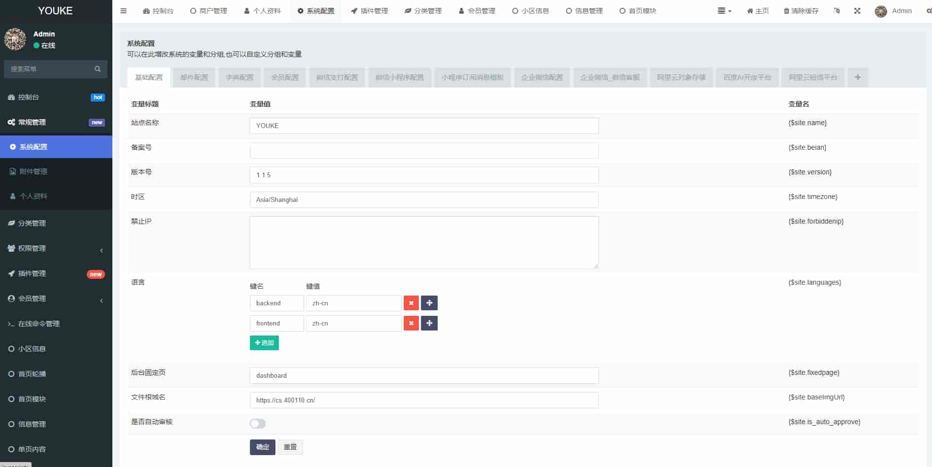 进入后台管理后,点击侧边栏目“常规管理”-“系统配置”,打开“微信小程序配置”选项卡,配置好你的微信小程序APPID和微信小程序AppSecret
