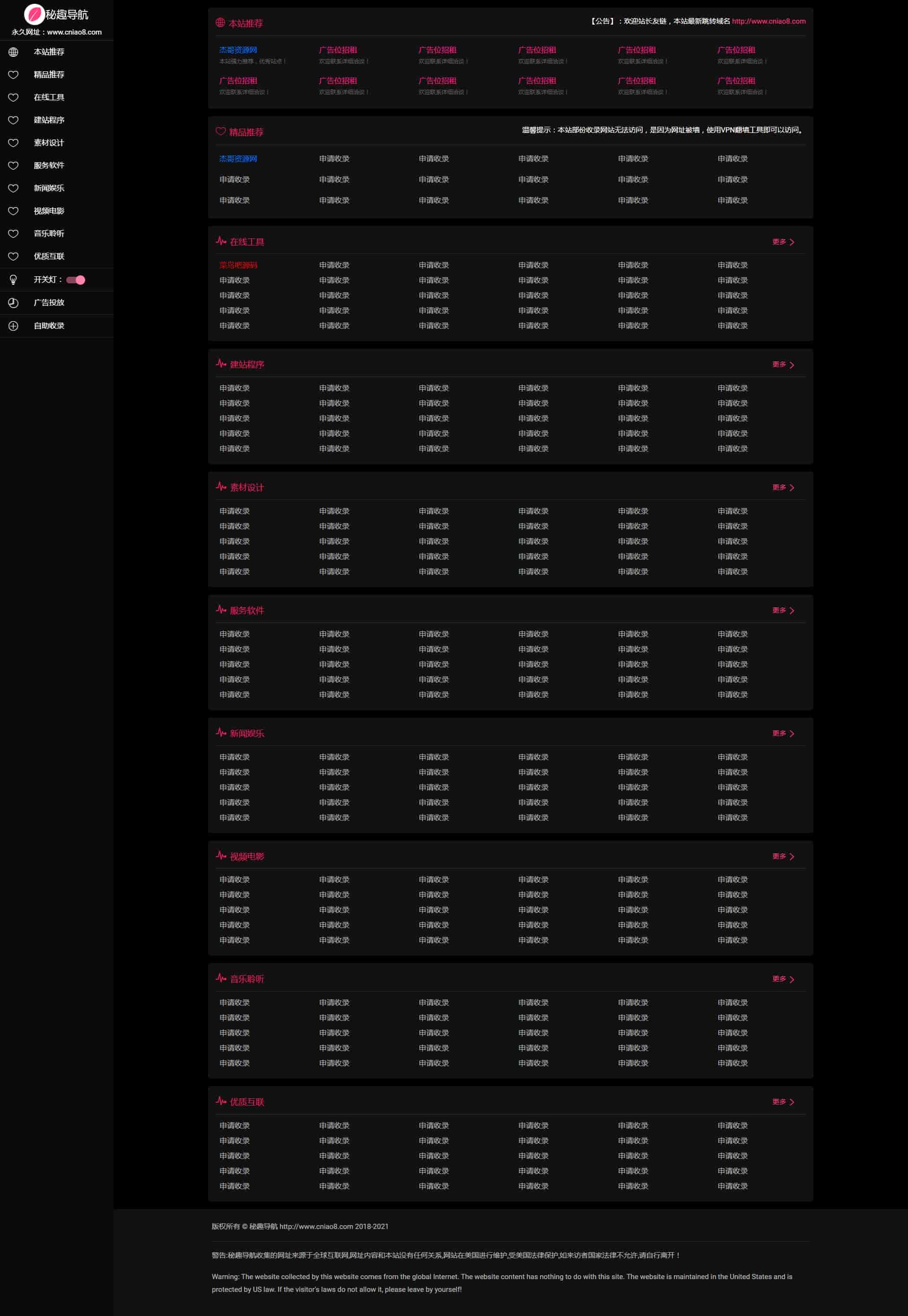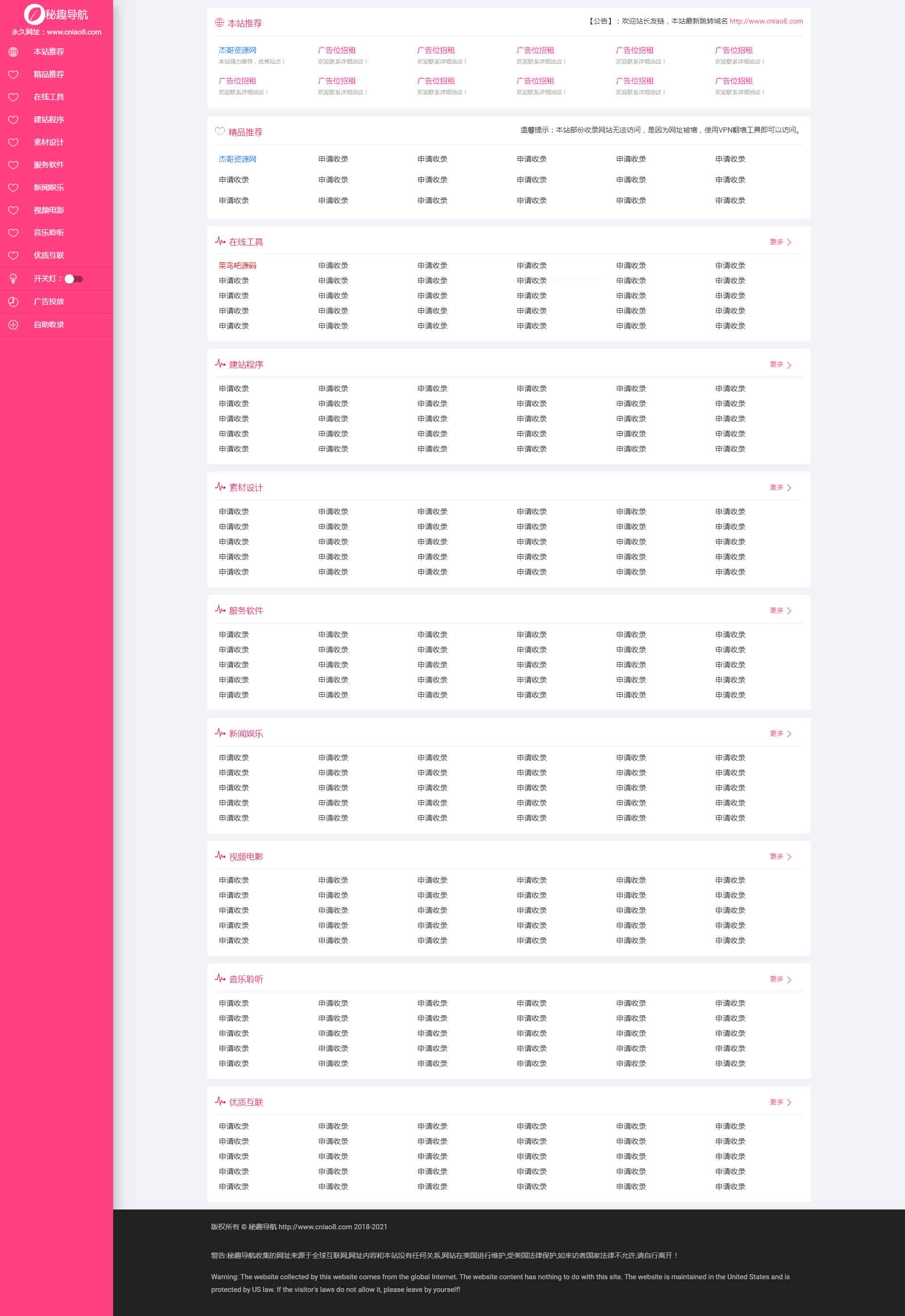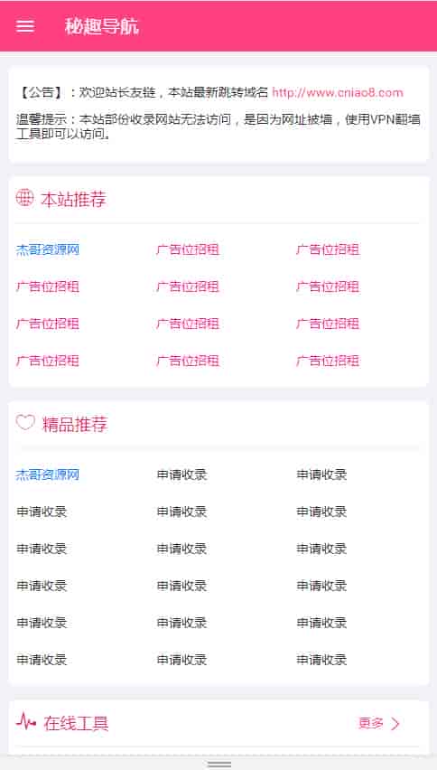 秘趣主题网址导航,基于flkc主题重写,一款不错的简约风格网址收录源码,全自动收录提交,适合于懒人模式,源码开源,后期流量起来了可以做个付费收录。