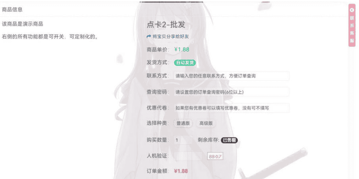 商品销售,支持商品配图、会员价、游客价、邮件通知、卡密预选(用户可以预选自己想购买的那个账号或者卡号)、API对接、强制登录购买、强悍的自定义控件功能、限时秒杀、批发优惠、优惠卷、等众多功能。
