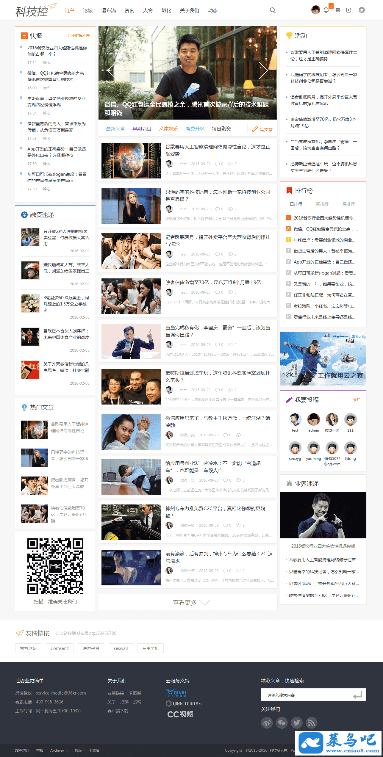 1.模板名称:【科技控】"资讯/创业/财经",版本支持:Discuzx3.0版本,discuzx3.1版本,discuzx3.2版本,网站页面宽度1180px,包括①网站首页②孵化③人物④资讯列表页⑤资讯内容页⑥论坛首页/列表页/内容页⑧瀑布流⑨关于我们10.其他页面等(可以添加N个)等,网站代码工整简洁seo优化良好,让您网站更佳汇聚人气,助您网站成功!具体使用教程,请参考使用word文档详细说明。