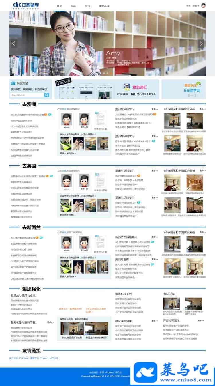 重写了门户首页,相似度达99.99% 重写了澳洲本科/英国本科页面,相似度达99.99%重写了成功案例等门户资讯列表页面,相似度达99.9%(另外在原有基础上增加了下级分类/相关分类)重写了门户资讯内容页的页面,在官方原有的基础上增加了很多功能官方没有的功能。(另外在原有基础上增加了下级分类/相关分类)重写了门户资讯的评论页面重写了关于门户各个页面的DIY文件。独家修复了发帖/发文章/回复等验证码不显示的问题。修复了论坛帖子列表下出现正在浏览板块的错版问题以及宽度错位问题。修复+调整了门户资讯及内容的面包屑途径。...其他各种修复优化/大家自行测试体验。。。。。。模板门户相关的页面目前调用的是帖子的数据,如需要调用门户文章数据的请自行备份好相关模块模板样式。再作修改。