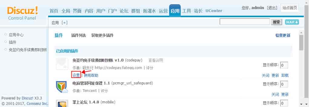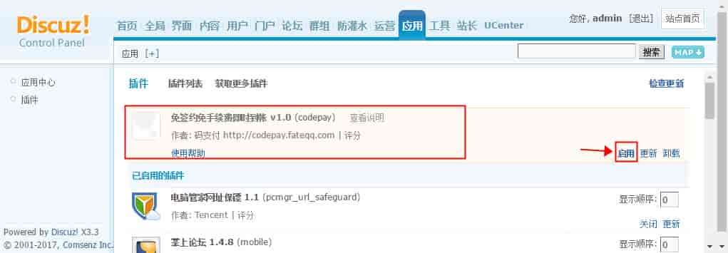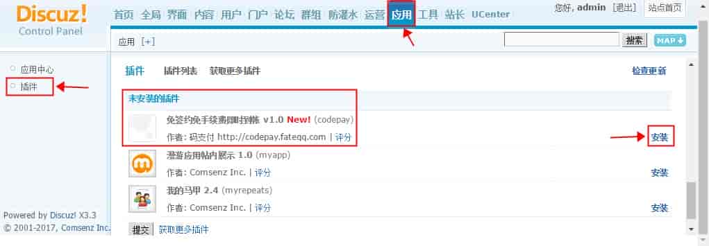 登录后台--》进入应用--》插件--》未安装的插件中找到该插件--》安装