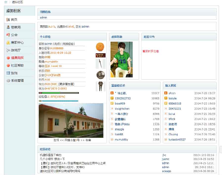 安装完成后,请先到后台插件设置里把“应用语言包”这项设置为和你论坛编码一致的编码(默认为GBK简体),否则新安装的应用会乱码“体力影响论坛”这一项请根据需要设置,如果开启此功能,那么社区的体力参数将和论坛挂钩,没有访问过社区的用户会被强制转入虚拟社区生成体力相关数据,第二次访问则不会强制转入社区,但仍受体力影响,用户查看帖子时会扣除体力,当体力小于或等于0时,用户访问论坛会弹出体力不足的提示框,但不影响用户继续访问论坛,可随时关闭窗口,用户如果不想受提示的干扰,必须到社区里的旅馆里休息以恢复体力