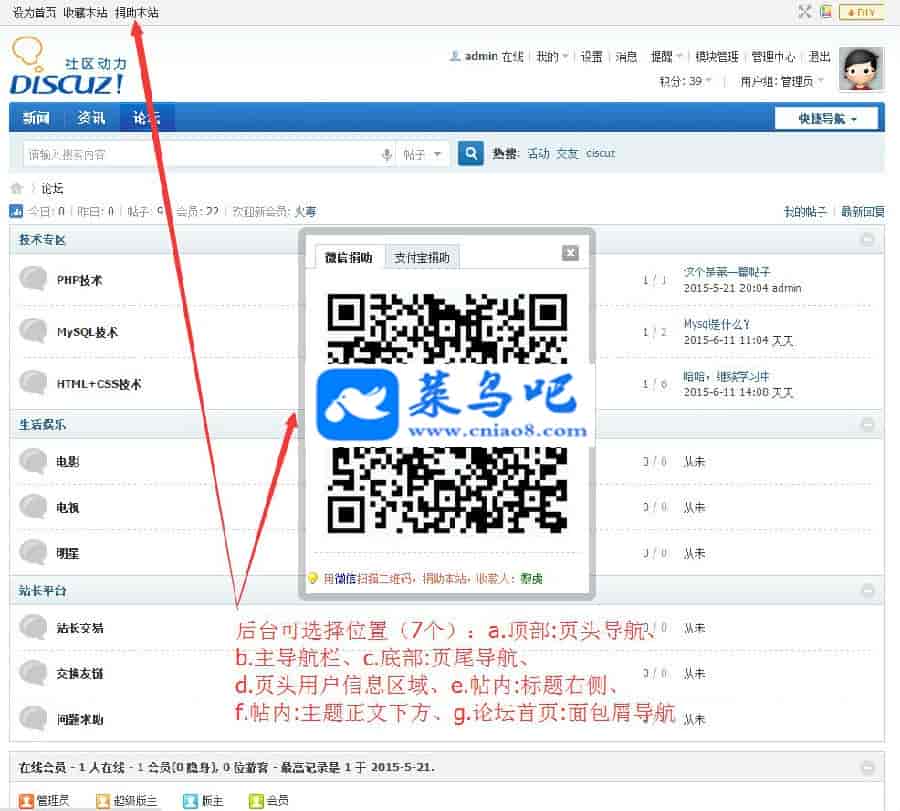 运行环境:X2.5 X3 X3.1 X3.2 F1.0 GBK BIG5 UTF8SC UTF8TC 1、本插件有“微信捐助”、“捐助”、“捐助开发者”三个模块,站长可在后台任意开启与关闭(其中免费版不支持关闭“捐助开发者”模块,免费版关闭本模块视为自动放弃插件使用权和应用授权!)
