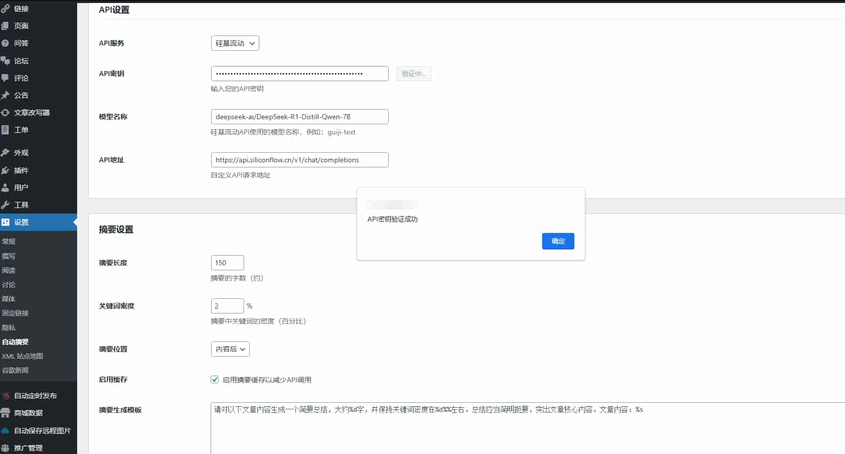 3. 进入”设置” > “自动摘要”配置插件