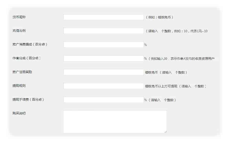 设置充值比例(例如:1元=10模板币)