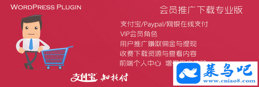 会员推广下载专业版是一款虚拟资源商城插件,经过完美测试运行于WordPress 3.1.x-4.x版本。本插件特点:高级VIP会员系统,银联/支付宝担保和即时到帐/贝宝paypal支付系统,前端注册和个人资料管理、查看订单信息等,推广提成系统,收费下载系统,下载加密。后续会按具体需要增加更多实用的功能。没有域名绑定,没有加密,小伙伴想怎么玩怎么改都可以,哦耶......(希望有想法的码农能一起研究开发) 此插件不含任何的售后及技术支持,仅供学习交流,其它用途请购买商业版,享受完美售后服务。