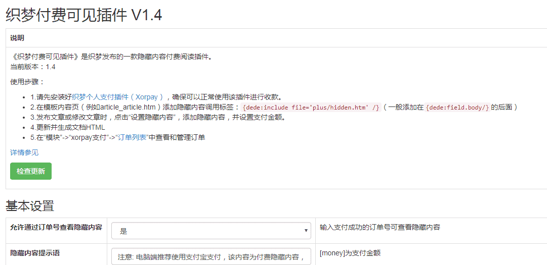 插件名称:织梦隐藏内容付费可见插件