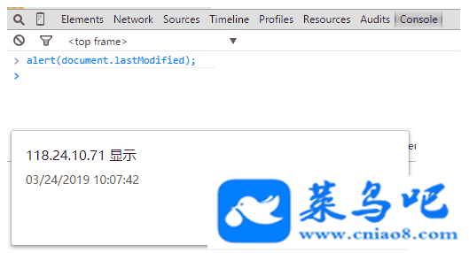 先用Chrome浏览器打开该网址 ,等网页完全打开后进入浏览器的控制台,方法:”开发者工具”-“错误控制台”,快捷键:shift+ctrl+J ,然后在控制台里面输入:alert(document.lastModified); ,按回车键后查看最后修改时间并记录。