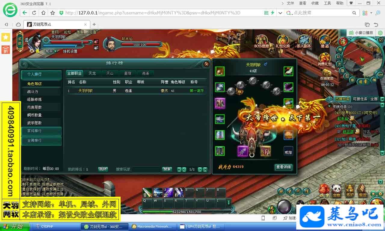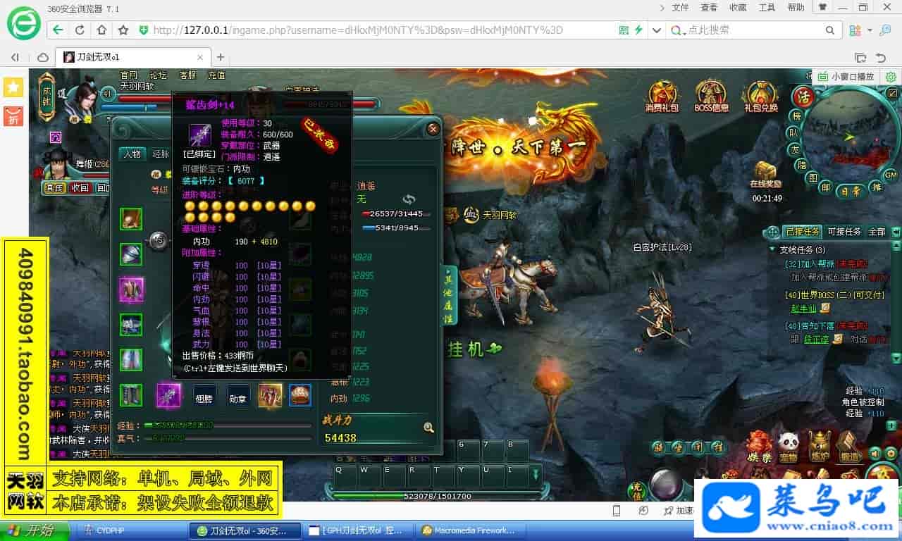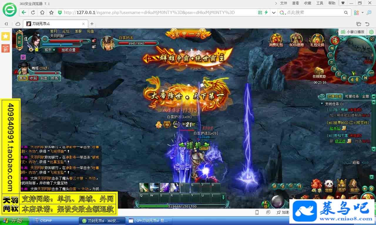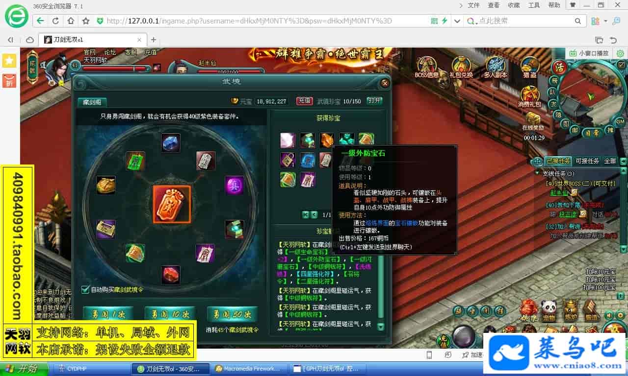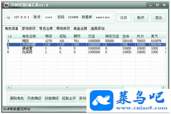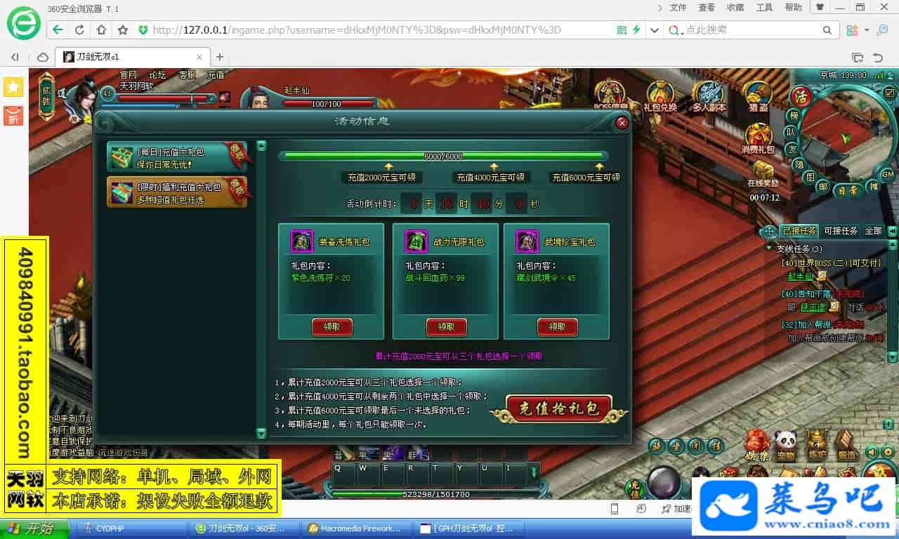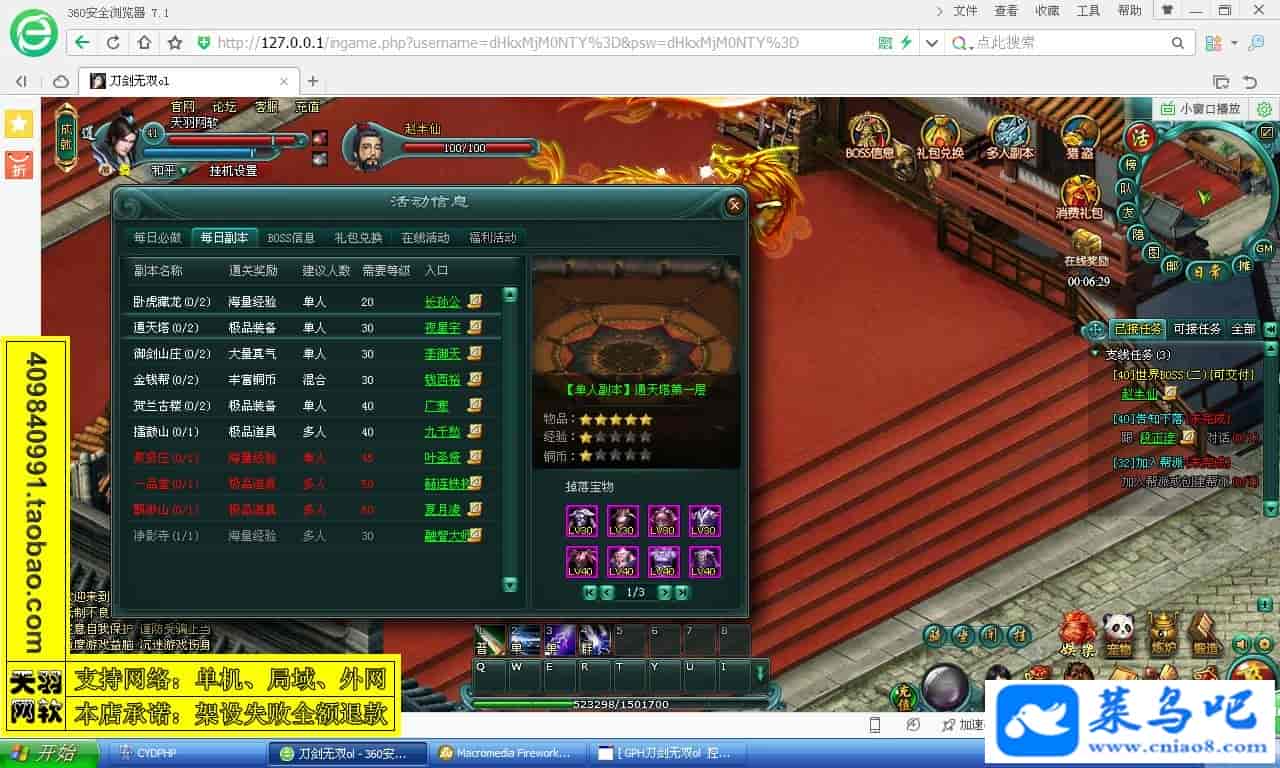 游戏名称:刀剑无双测试状态:单机、局域、外网 ( 架设外网仅支持独立服务器+IP )支持系统:服务端架设系统win2003/XP -32位;玩家系统无限制架设要求:请保证服务端所需端口全部开启且未被占用(系统问题请自行解决)配置要求:CPU双核+内存1G+硬盘10G(服务端D盘架设)架设难度:一键端架设指导:语音视频帐号注册:网站数据修改:GM工具、一键IP修改工具↓↓游戏更新↓↓1.增加GM工具2.增加一键IP修改工具图片展示: