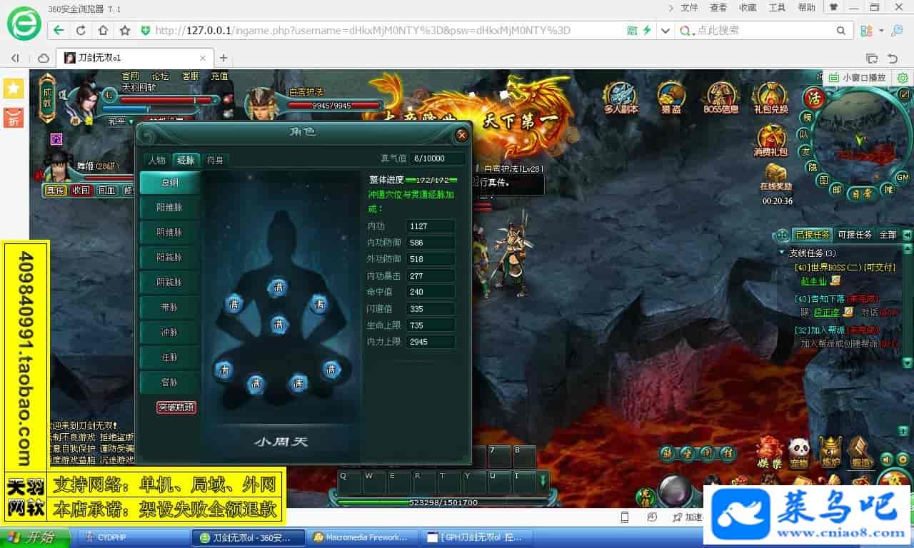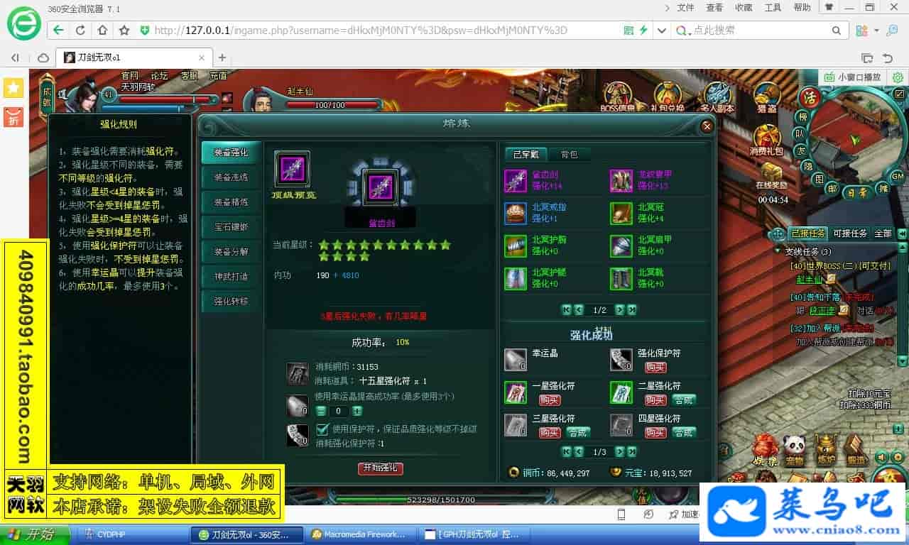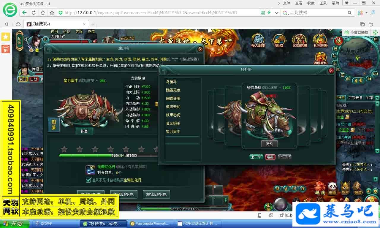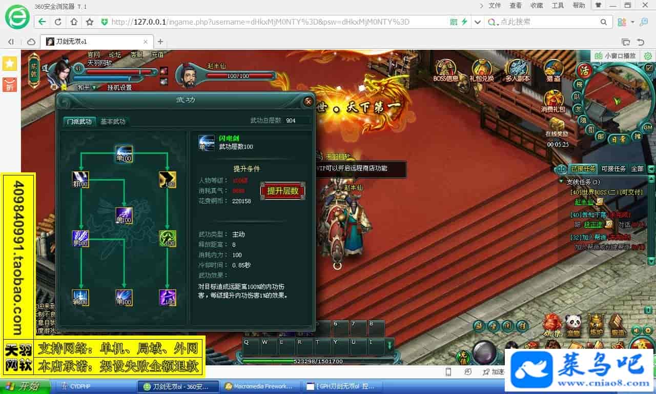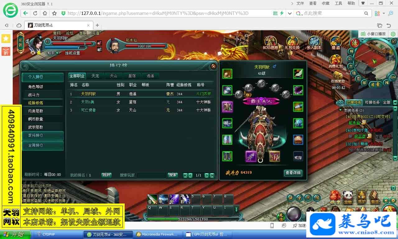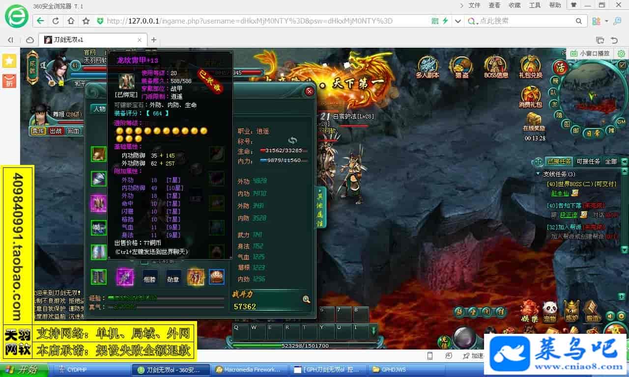 游戏名称:刀剑无双测试状态:单机、局域、外网 ( 架设外网仅支持独立服务器+IP )支持系统:服务端架设系统win2003/XP -32位;玩家系统无限制架设要求:请保证服务端所需端口全部开启且未被占用(系统问题请自行解决)配置要求:CPU双核+内存1G+硬盘10G(服务端D盘架设)架设难度:一键端架设指导:语音视频帐号注册:网站数据修改:GM工具、一键IP修改工具↓↓游戏更新↓↓1.增加GM工具2.增加一键IP修改工具图片展示: