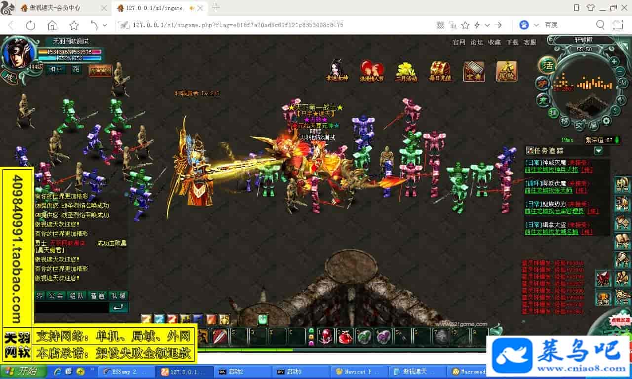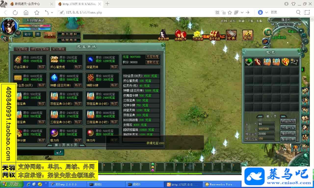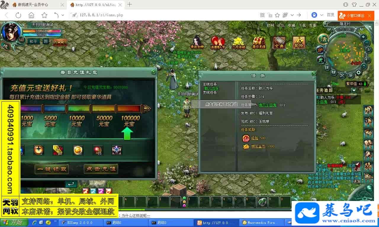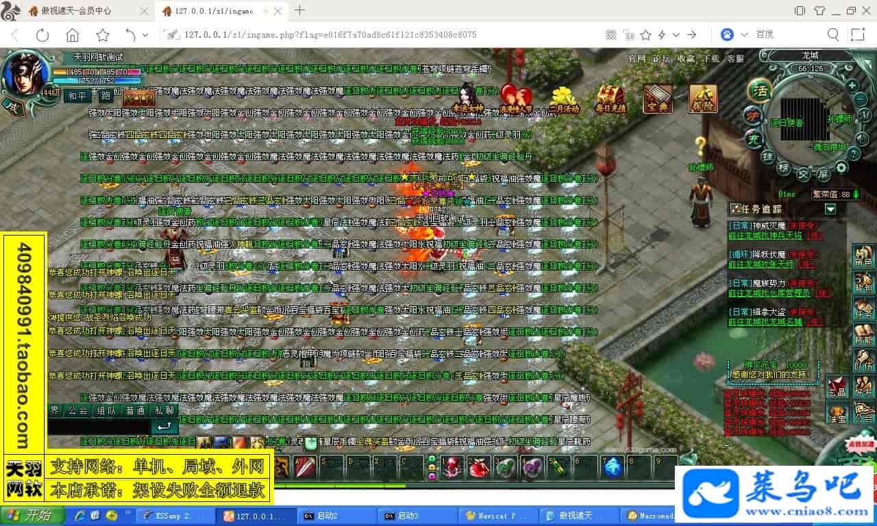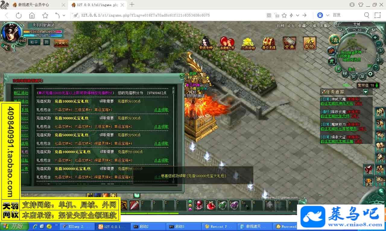 游戏名称:傲视遮天测试状态:单机、局域、外网 ( 架设外网仅支持独立服务器+IP )支持系统:服务端架设系统win2003/XP -32位;玩家系统无限制架设要求:请保证服务端所需端口全部开启且未被占用(系统问题请自行解决)配置要求:CPU双核+内存1G+硬盘10G(服务端D盘架设)架设难度:一键端架设指导:语音视频帐号注册:网站数据修改:GM工具、一键IP修改工具↓↓游戏更新↓↓1.增加GM工具2.增加一键IP修改工具图片展示: