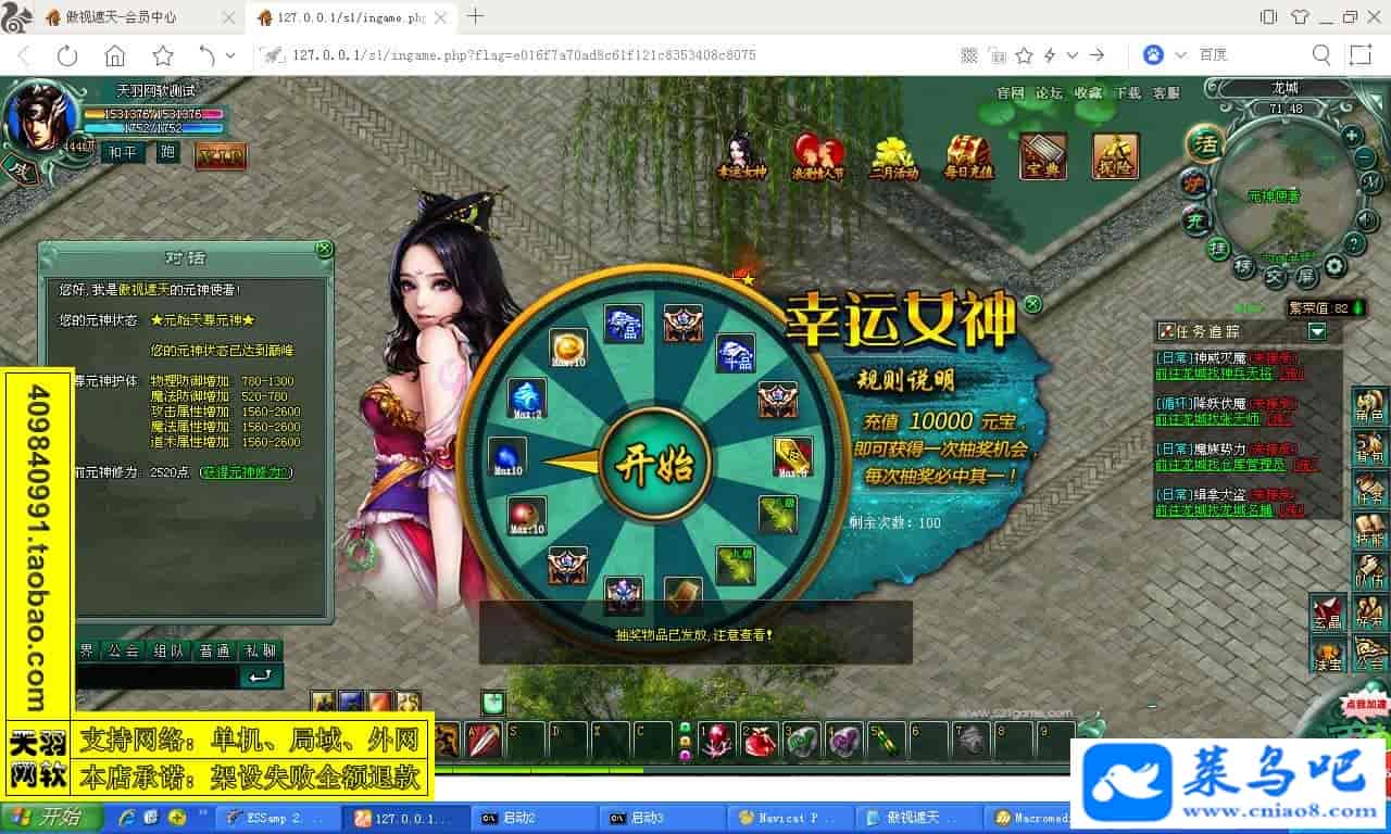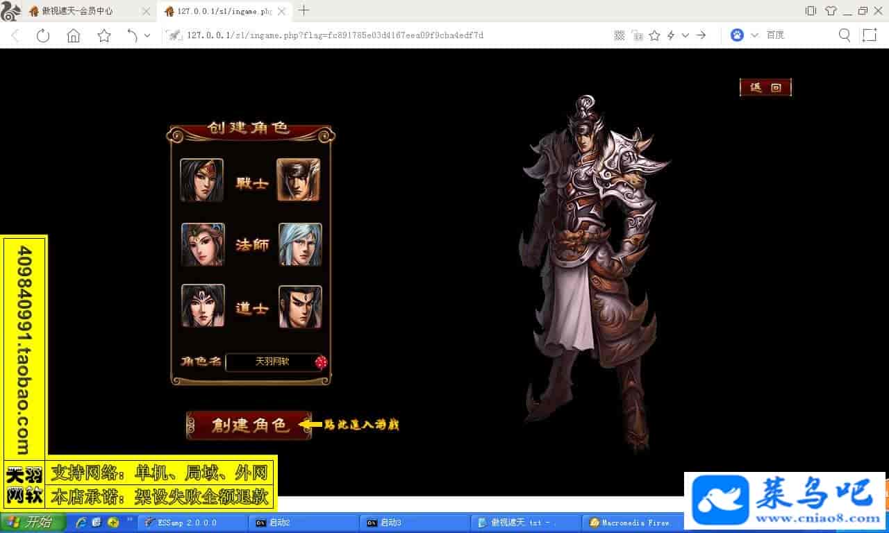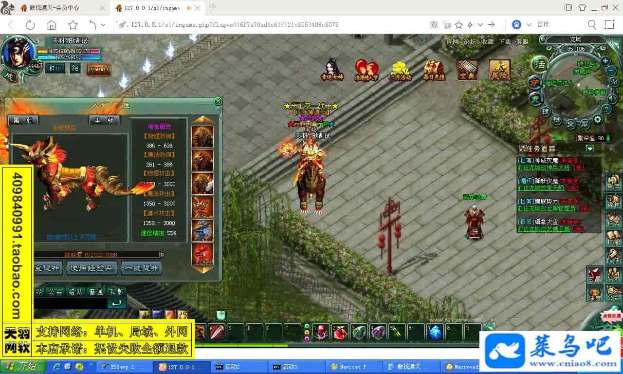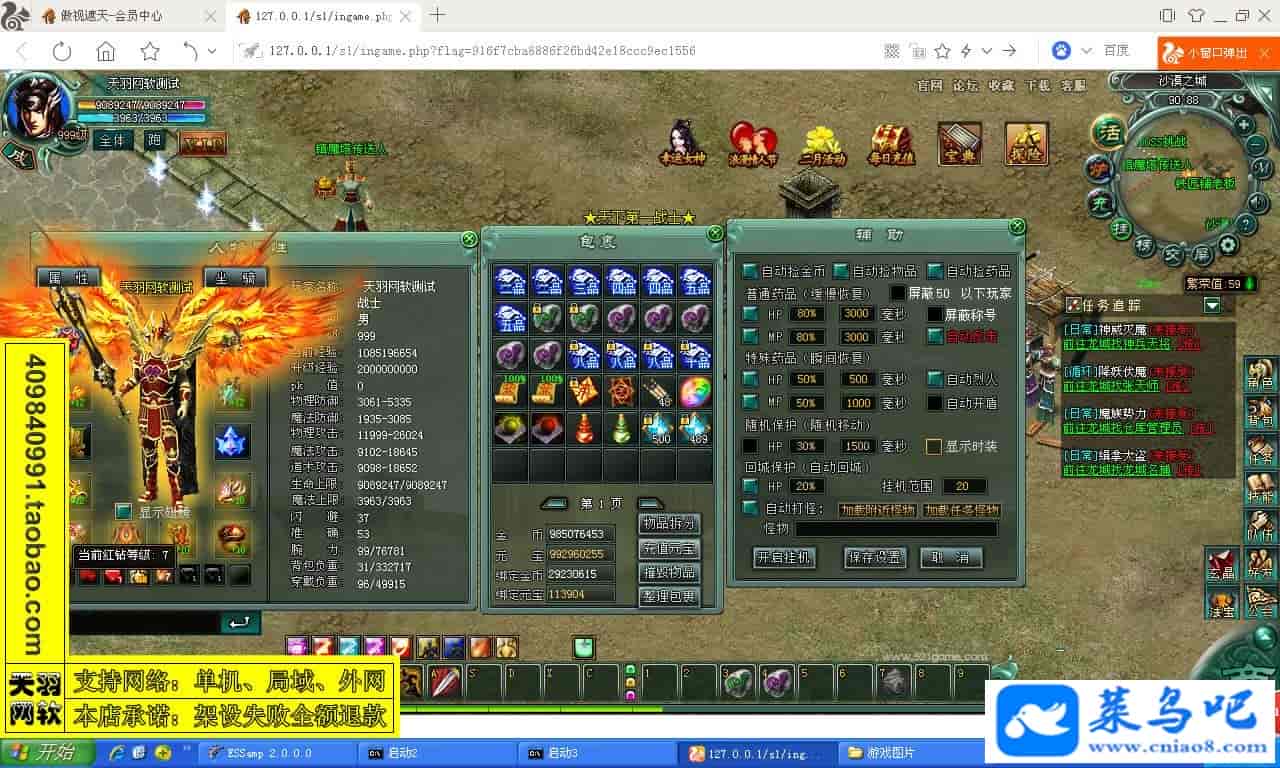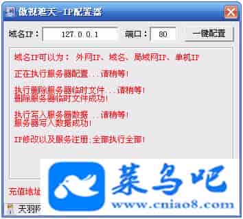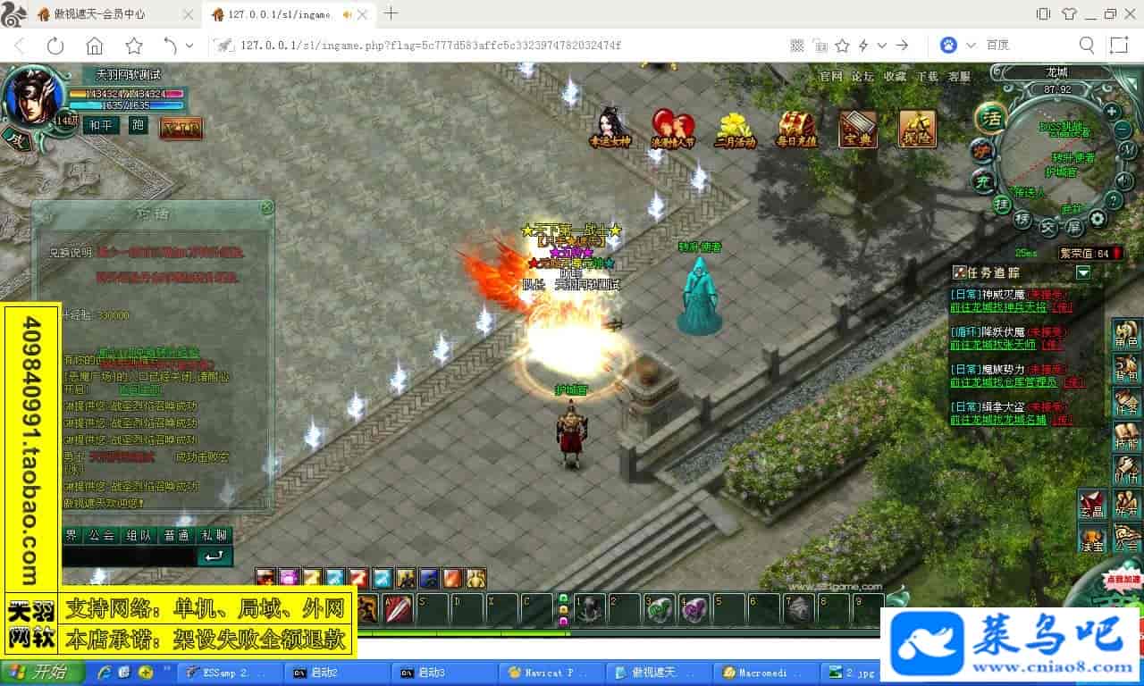 游戏名称:傲视遮天测试状态:单机、局域、外网 ( 架设外网仅支持独立服务器+IP )支持系统:服务端架设系统win2003/XP -32位;玩家系统无限制架设要求:请保证服务端所需端口全部开启且未被占用(系统问题请自行解决)配置要求:CPU双核+内存1G+硬盘10G(服务端D盘架设)架设难度:一键端架设指导:语音视频帐号注册:网站数据修改:GM工具、一键IP修改工具↓↓游戏更新↓↓1.增加GM工具2.增加一键IP修改工具图片展示:
